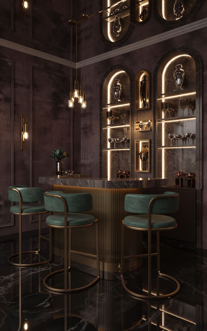 A dimly lit, clandestine atmosphere pervades this intimate Art Deco home bar. Deep, textured burgundy walls and a gleaming black marble floor set a moody, sophisticated tone. Three bar stools, upholstered in forest green leather with elegant brass frames, are arranged around a curved, ribbed brass bar front. Arched, illuminated niches behind the bar showcase a collection of spirits and glassware, their golden glow reflecting in the polished marble countertop. Delicate pendant lights and a minimalist wall sconce provide subtle illumination, crafting a perfect nook for quiet contemplation or hushed, late-night conversations.