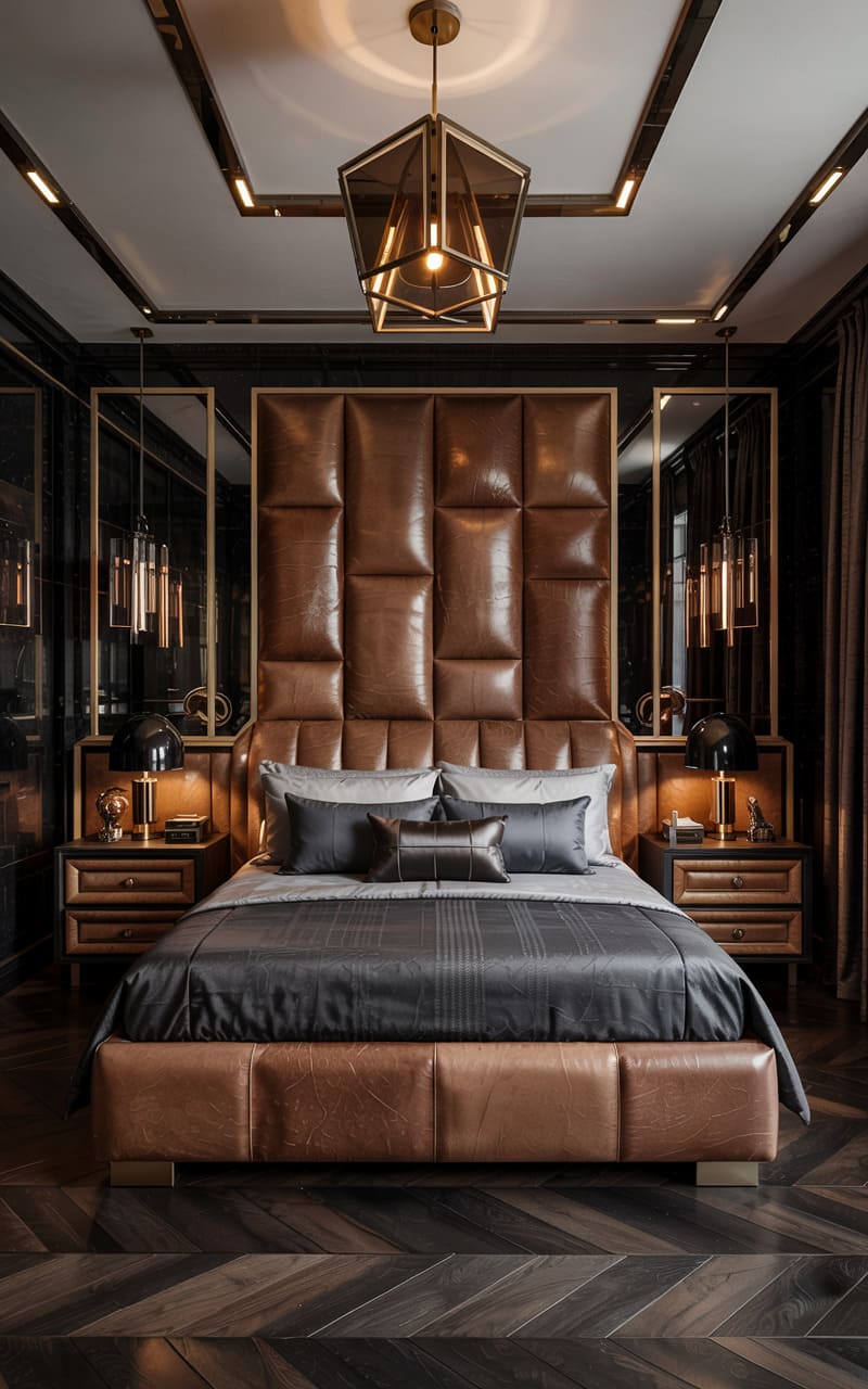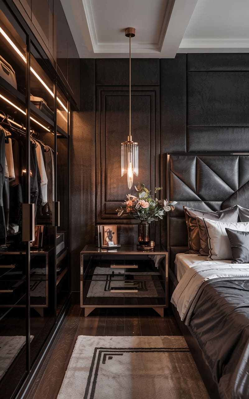 Masculine elegance defines this Art Deco bedroom, where dark, textured paneling creates a sophisticated and moody backdrop. A sleek, minimalist bed with a grey leather headboard is flanked by a mirrored nightstand, upon which a simple pendant light casts a focused glow. An open-fronted closet with integrated lighting reveals a meticulously organized wardrobe. The dark wooden floor is softened by a geometric-patterned rug in muted tones. This space is a study in refined restraint and luxurious textures, a modern interpretation of Deco sensibilities designed for serene repose.