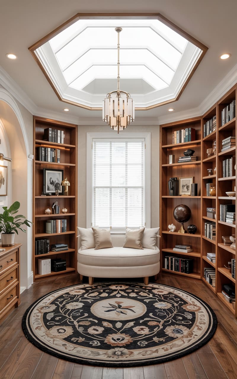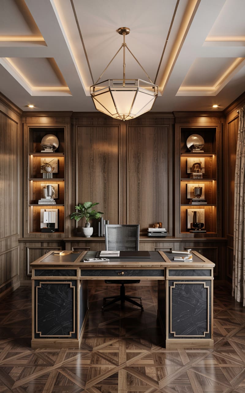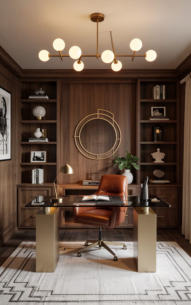 Warm wood paneling and brass accents create an inviting, scholarly atmosphere in this Art Deco home office. Built-in bookshelves line the walls, thoughtfully arranged with books and decorative objects. A sleek desk with a glass top and substantial brass block supports is paired with a comfortable tan leather executive chair. A striking circular brass mirror hangs above the desk, reflecting the room’s warm illumination from a modern multi-globe chandelier. A geometric-patterned rug in cream and black adds a touch of classic Deco patterning, completing this sophisticated and productive workspace.