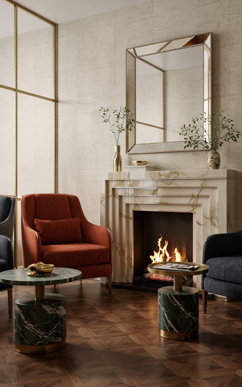 A cozy inglenook fireplace, crafted from veined marble and framed by light, textured walls with subtle gold linear accents, forms the heart of this Art Deco sitting area. Two plush armchairs, one in deep terracotta and the other in dark blue, offer comfortable fireside seating. Small, dark marble-topped occasional tables with brass bases provide convenient surfaces. A large, simple mirror above the mantel reflects the warm glow of the fire and the room’s ambient illumination. Herringbone-patterned wood flooring adds a classic touch to this intimate and inviting retreat.