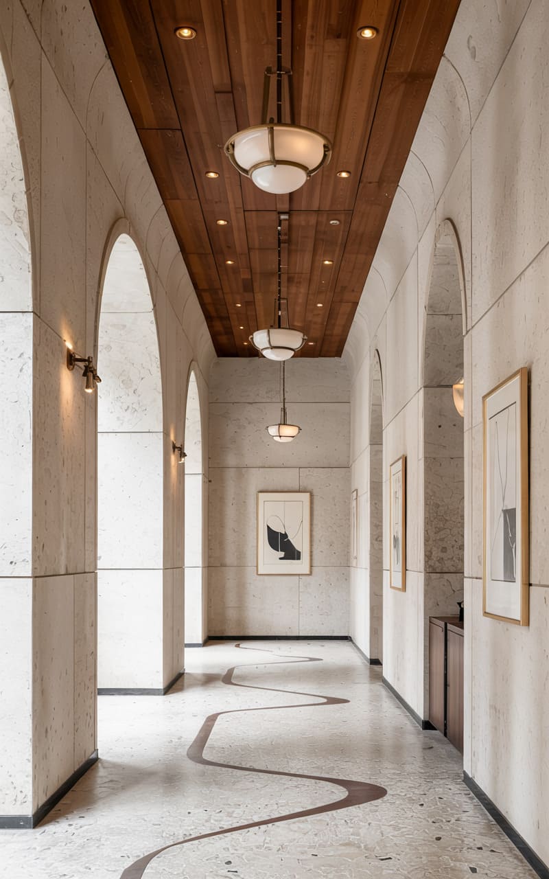 Graceful arches and warm, diffused light characterize this serene Art Deco hallway. Pale, textured walls and terrazzo flooring with a subtle, meandering inlay create a soft, welcoming pathway. A rich wood-paneled ceiling with inset downlights adds warmth and visual interest. Pendant lights, with their classic milk-glass shades, hang at varying heights, casting a gentle glow. Framed abstract art adorns the walls, adding a touch of modern sophistication to this elegantly understated transitional space, designed to lead the eye and invite further exploration.