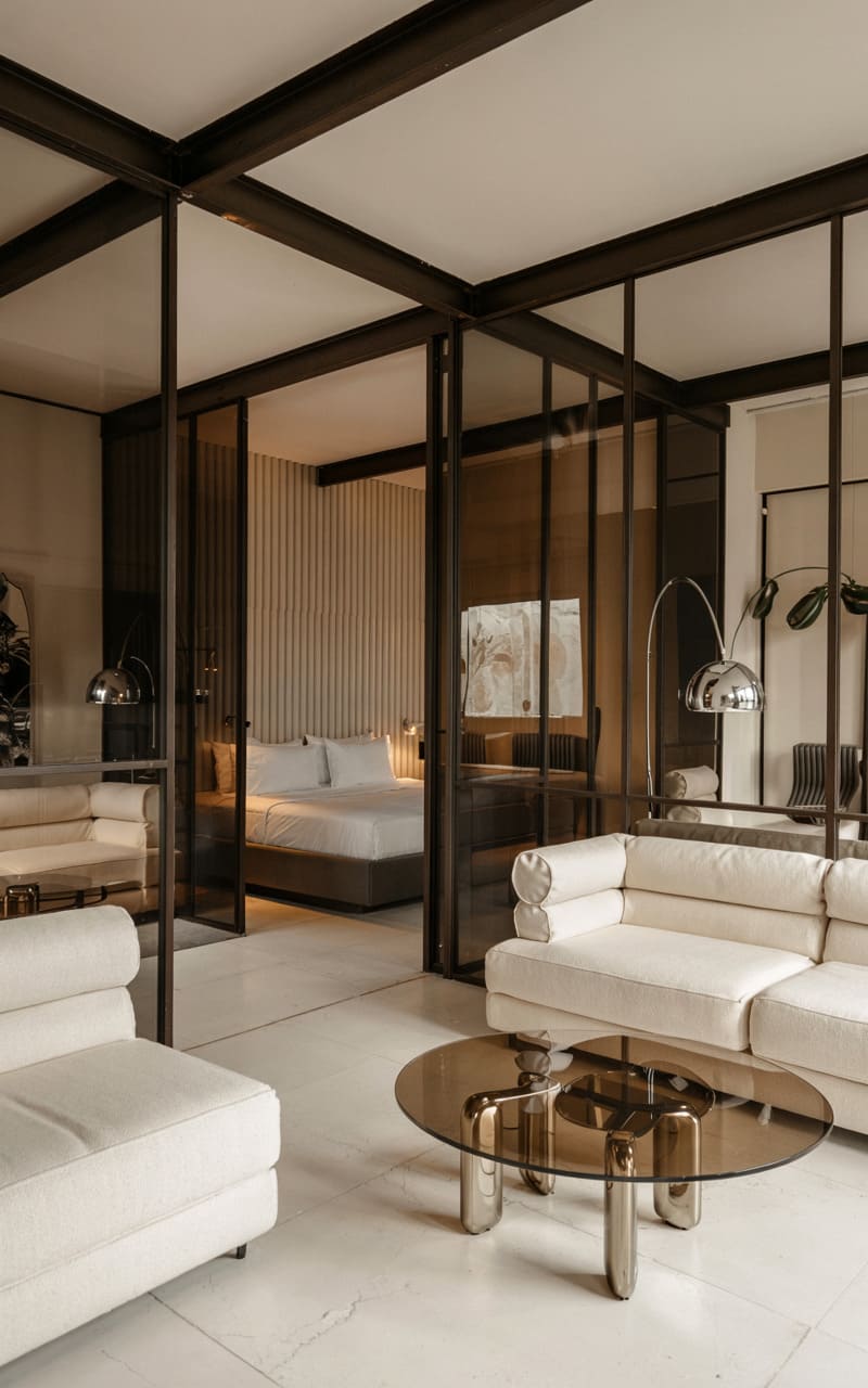 An open-plan living and sleeping area is cleverly defined by a system of dark-framed glass partitions in this contemporary Art Deco apartment. A plush white sectional sofa and a tinted glass coffee table occupy the living space, which offers a view into the serene bedroom beyond. The bedroom features a bed with white linens and a subtly ribbed headboard. Polished white flooring enhances the sense of light and space, while minimalist arc lamps provide sculptural illumination. This design achieves a seamless blend of openness and intimacy, all within a sophisticated, modern Deco framework.