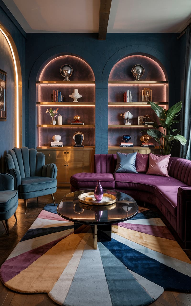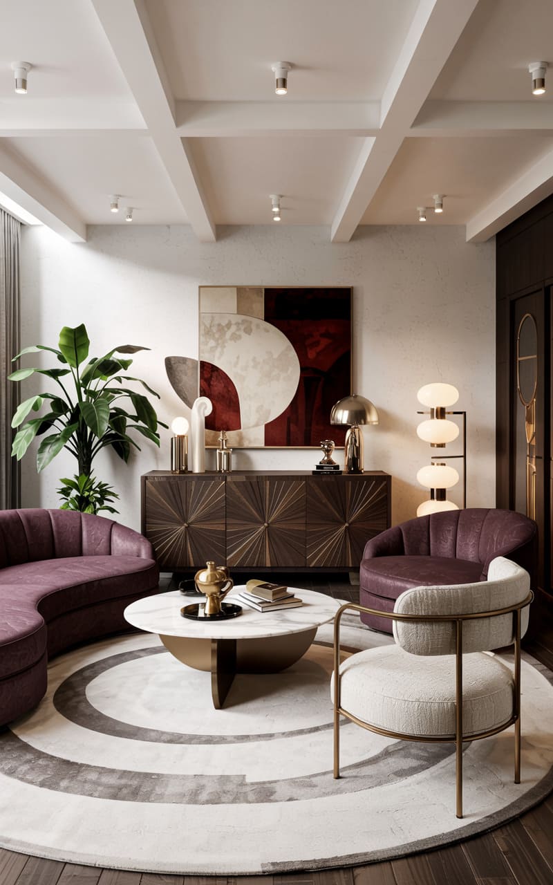 Curvaceous forms and a rich jewel-toned palette create a sumptuous atmosphere in this Art Deco living room. A sweeping, deep plum velvet sofa and a coordinating armchair provide luxurious seating, arranged on a circular rug with a radiating pattern in cream and plum. A low, white marble coffee table with a brass base sits at the center. A dark wood credenza with a starburst inlay displays sculptural accessories and a modern, multi-globe floor lamp. Large abstract artwork in complementary hues ties the scheme together, resulting in a space that is both opulent and inviting.