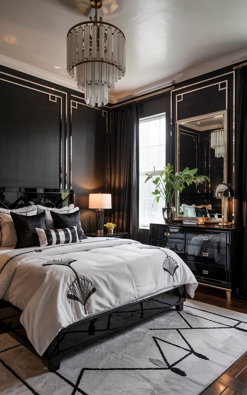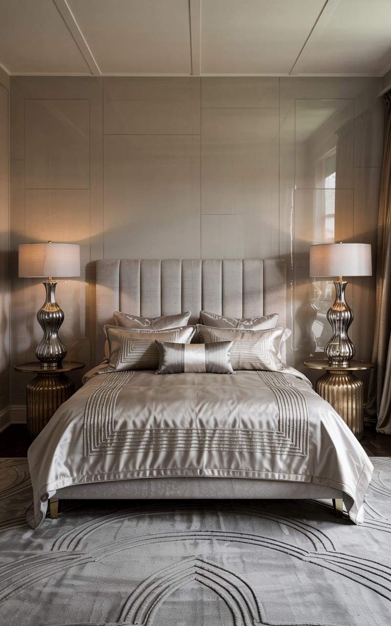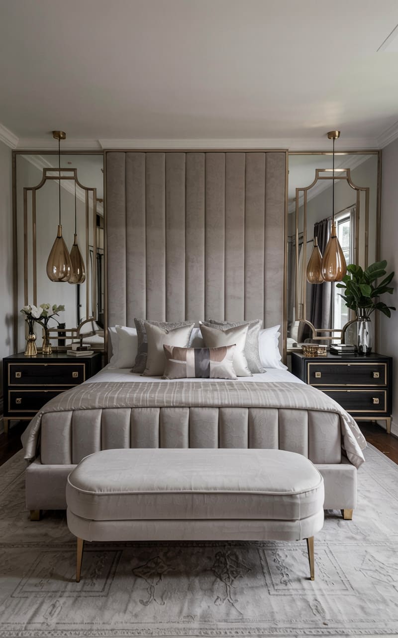 22. Art Deco Bedroom with Channel-Tufted Bed and Lacquered Nightstands