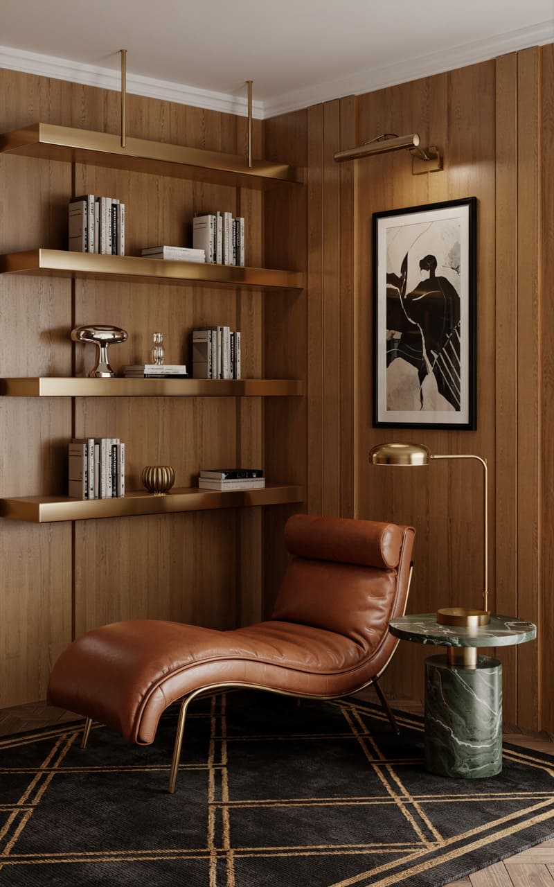 A cozy reading nook in this Art Deco styled room beckons with its rich, warm wood paneling. Brass shelves, suspended by slender rods, display a curated collection of books and objets d’art. A comfortable chaise lounge, upholstered in supple cognac leather, invites relaxation. A small, green marble-topped side table with a brass base holds a sleek brass reading lamp. The dark, patterned rug with gold geometric lines adds another layer of classic Deco charm, creating an intimate and sophisticated sanctuary for literary escape.