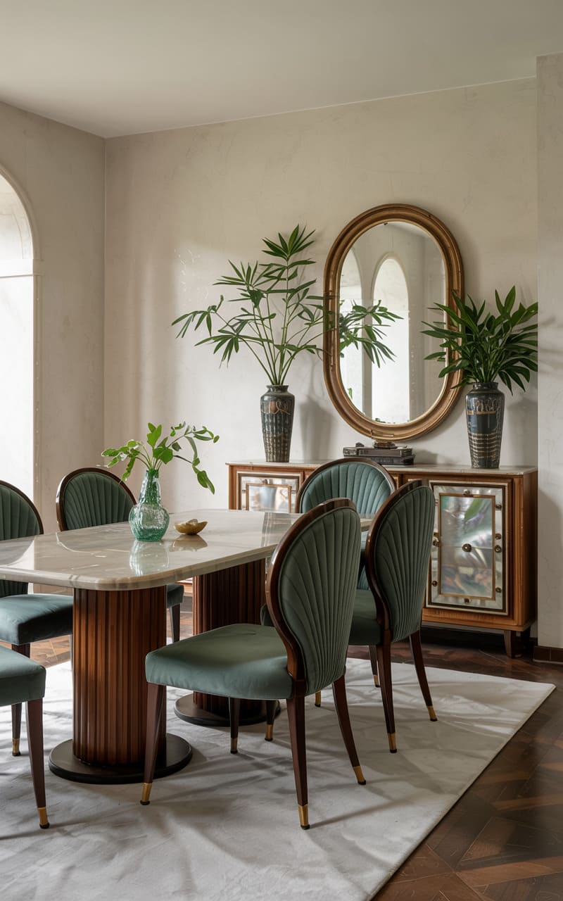 Understated elegance characterizes this Art Deco dining room, where a light marble-topped table with a fluted dark wood base takes center stage. Chairs upholstered in rich green velvet with dark wood legs provide comfortable and stylish seating. A dark wood credenza with mother-of-pearl inlaid doors and an oval, gold-framed mirror above it add a touch of classic glamour. Large potted plants bring a touch of nature indoors. The scene is illuminated by natural light from an arched window, creating a bright and inviting space for refined dining.