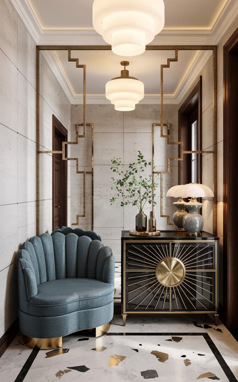 A petite yet powerful statement is made in this Art Deco entryway. A scalloped, teal velvet armchair offers a plush welcome, complemented by a black and gold console table adorned with a striking sunburst motif on its cabinet door. Above, a distinctive, tiered milk-glass ceiling fixture casts a soft, ambient glow, while a table lamp with a grey ceramic base provides additional illumination. The terrazzo floor, speckled with gold and dark chips, and the geometric gold metalwork on the wall, add layers of classic Deco detailing, creating a chic and memorable first impression.