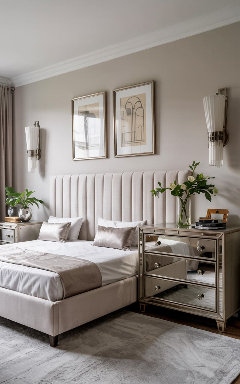 A vision of serene luxury, this Art Deco bedroom features a tall, channel-tufted headboard in creamy velvet, creating a soft and inviting focal point. Mirrored nightstands flank the bed, reflecting the light from elegant, ribbed glass wall sconces. The bed is dressed in crisp white linens and shimmering satin pillows in muted tones. A subtly patterned grey rug adds texture underfoot. Framed Art Deco prints above the bed complete the sophisticated and tranquil ambiance, making this a perfect haven for restful slumber.