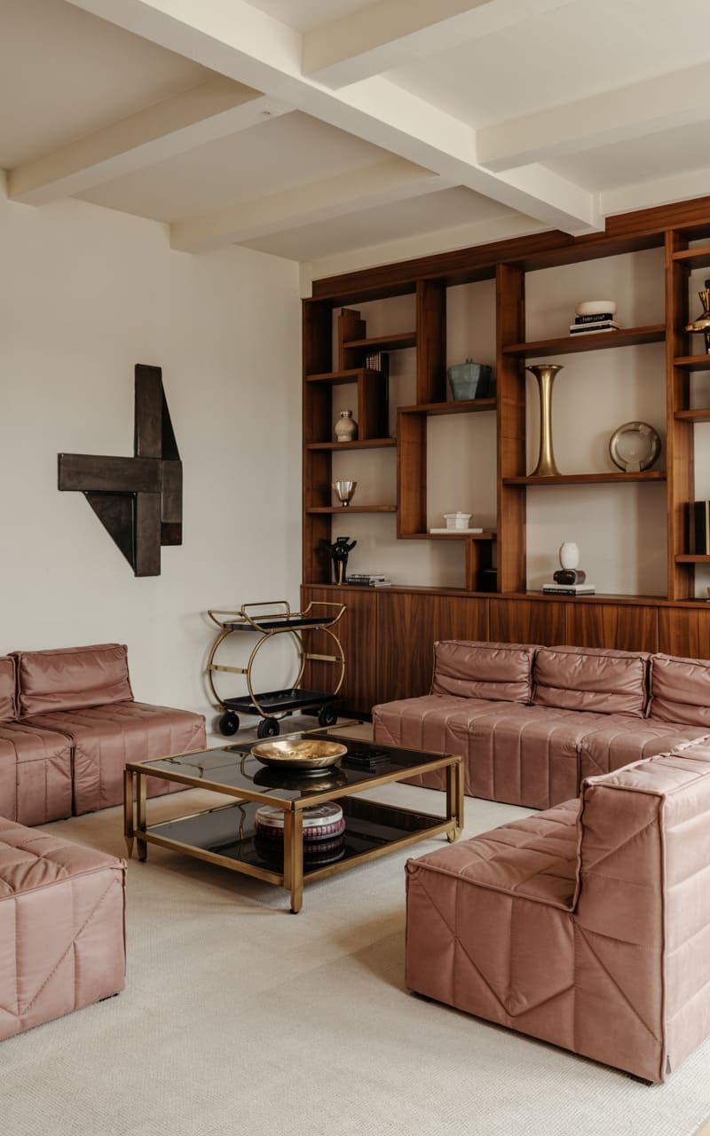 Warm, rosy-hued modular sofas with a quilted, geometric pattern offer inviting comfort in this contemporary Art Deco living space. A dark, glass-topped coffee table with a brass frame sits at the center of the arrangement. Extensive, rich wood built-in shelving lines one wall, displaying a collection of books and ceramics, punctuated by a striking, dark abstract metal wall sculpture. A brass bar cart adds a touch of vintage glamour. The light-colored, textured rug grounds the space, creating a harmonious blend of modern comfort and classic Deco influences.