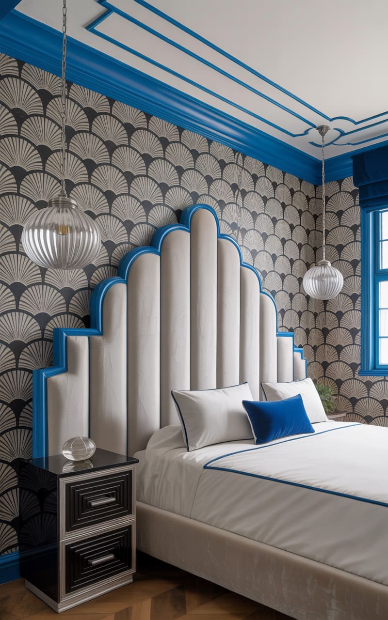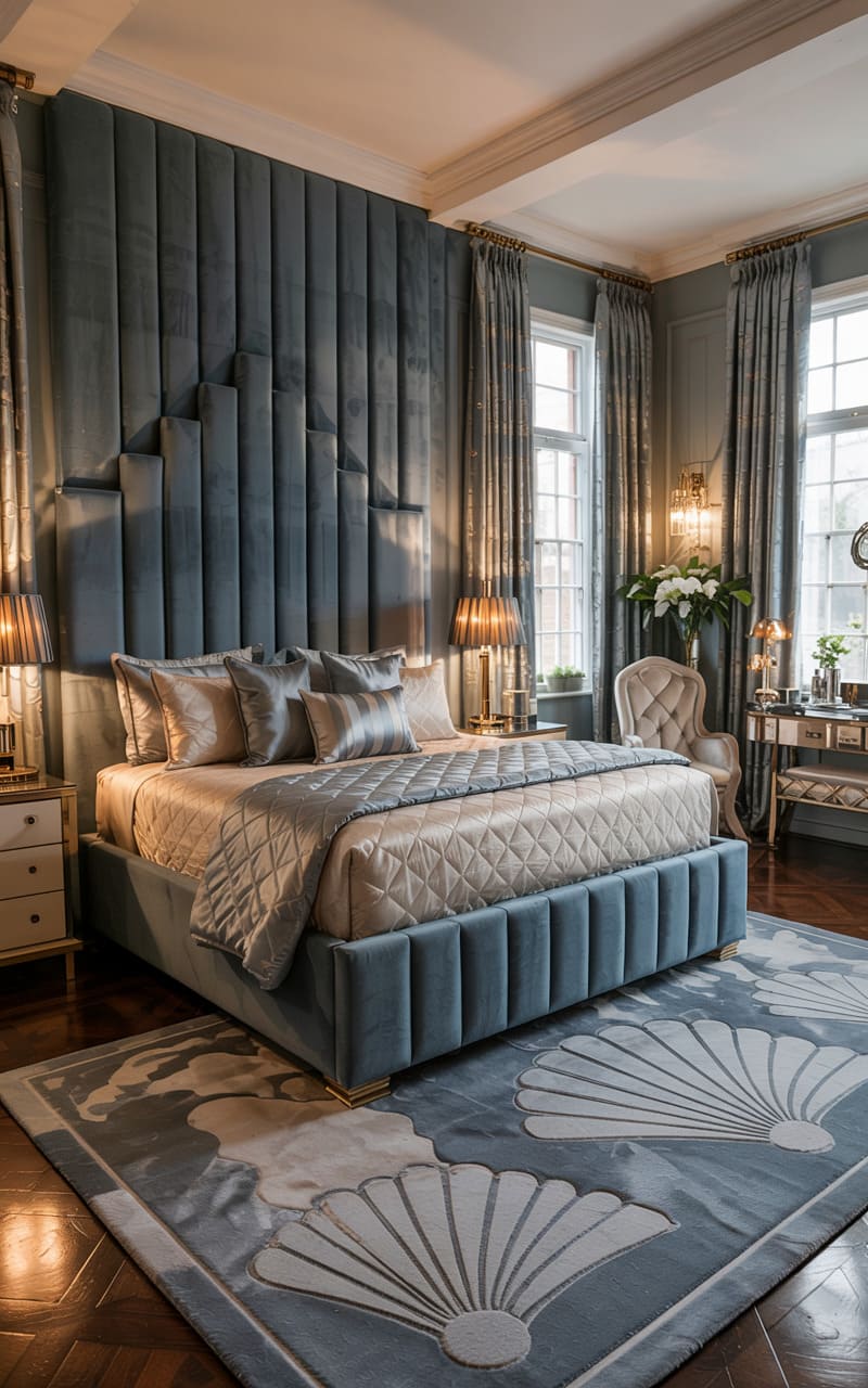 Dramatic height and opulent textures define this Art Deco bedroom. A soaring, channel-tufted headboard in deep teal velvet, designed with stepped, geometric forms, commands the room. The bed is lavishly dressed in shimmering satin bedding in shades of blue and champagne. Elegant table lamps with dark shades cast a warm, inviting glow. A large rug featuring bold, stylized shell or fan motifs in blues and creams lies underfoot, enhancing the room’s grandeur. This chamber is a luxurious sanctuary, exuding an air of theatrical glamour and sophisticated comfort.