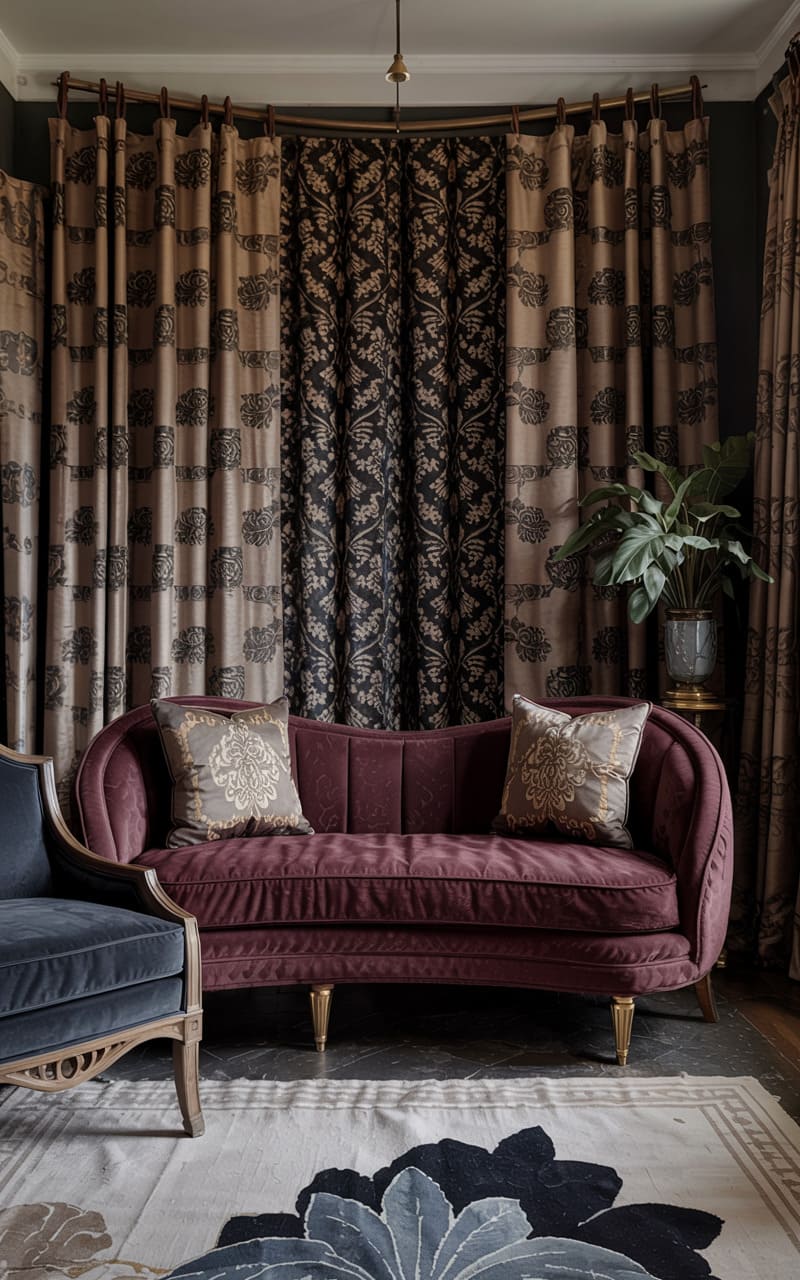 Rich jewel tones and intricate patterns create a sumptuous, intimate atmosphere in this Art Deco seating nook. A gracefully curved sofa, upholstered in deep burgundy velvet, is accented with patterned throw pillows. Heavy curtains, featuring a bold, stylized floral motif in black and gold, frame the space, adding a layer of theatricality. A dark velvet armchair provides additional seating. The rug, with its large-scale floral or fan design in dark hues, complements the opulent textiles, crafting a cozy and glamorous retreat perfect for quiet conversation.