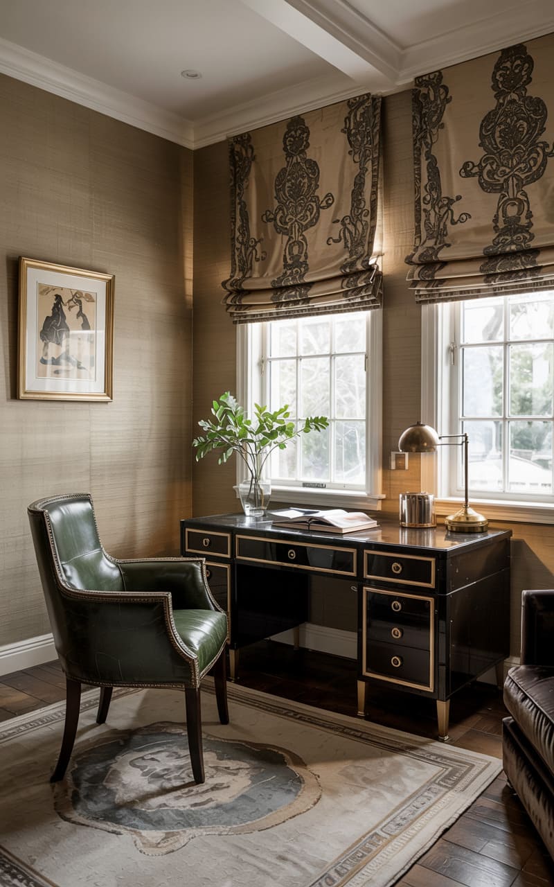 A sense of refined masculinity pervades this Art Deco home office. Grasscloth wallpaper in a warm, neutral tone provides a textured backdrop. A substantial black lacquered desk with gold detailing offers an elegant workspace, complemented by a dark green leather armchair. Roman blinds, crafted from a fabric with a bold, damask-like Art Deco pattern, dress the windows, filtering the exterior light. A framed equestrian print adds a classic touch. The dark wood floor is partially covered by a vintage-style rug, completing this sophisticated and productive environment.