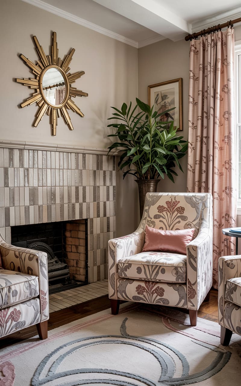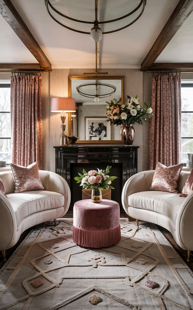 Soft romance and gentle curves define this inviting Art Deco sitting room. Two crescent-shaped sofas in a creamy white fabric face each other, centered around a plush, fringed pink ottoman that serves as a coffee table. A delicate arrangement of pink roses adds a touch of natural beauty. The fireplace, with its simple black surround, is topped by a large mirror reflecting the room’s warm illumination from a shaded table lamp. Pink patterned curtains frame the windows, and a subtly patterned rug enhances the room’s cozy, feminine charm.