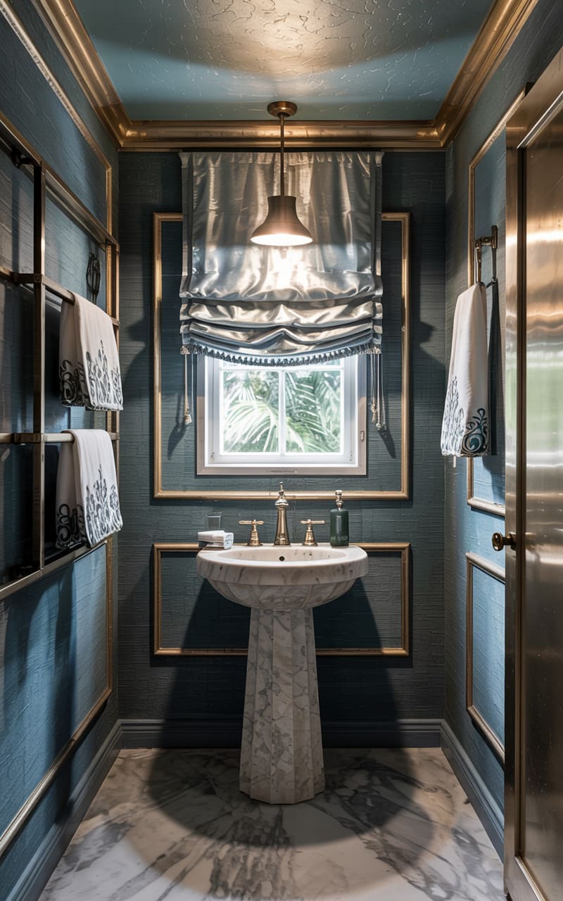 A compact powder room is transformed into a jewel box of Art Deco design. Textured blue wallpaper provides a rich backdrop, accented by gold trim creating elegant rectangular panels. A classic marble pedestal sink stands prominently, its veined surface adding a touch of natural luxury. A Roman blind in shimmering silver fabric dresses the small window. The floor, a complex pattern of white and grey marble, and a simple pendant light complete this exquisitely detailed and sophisticated small space.