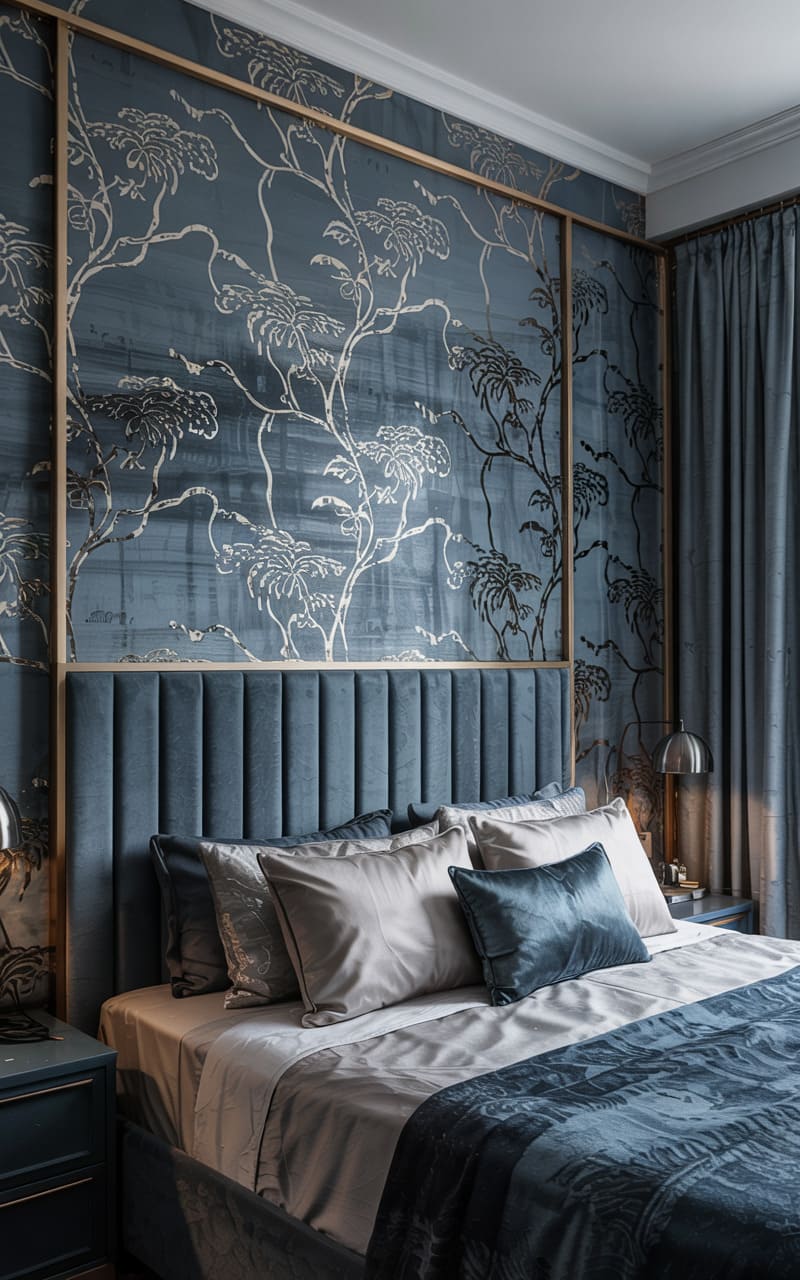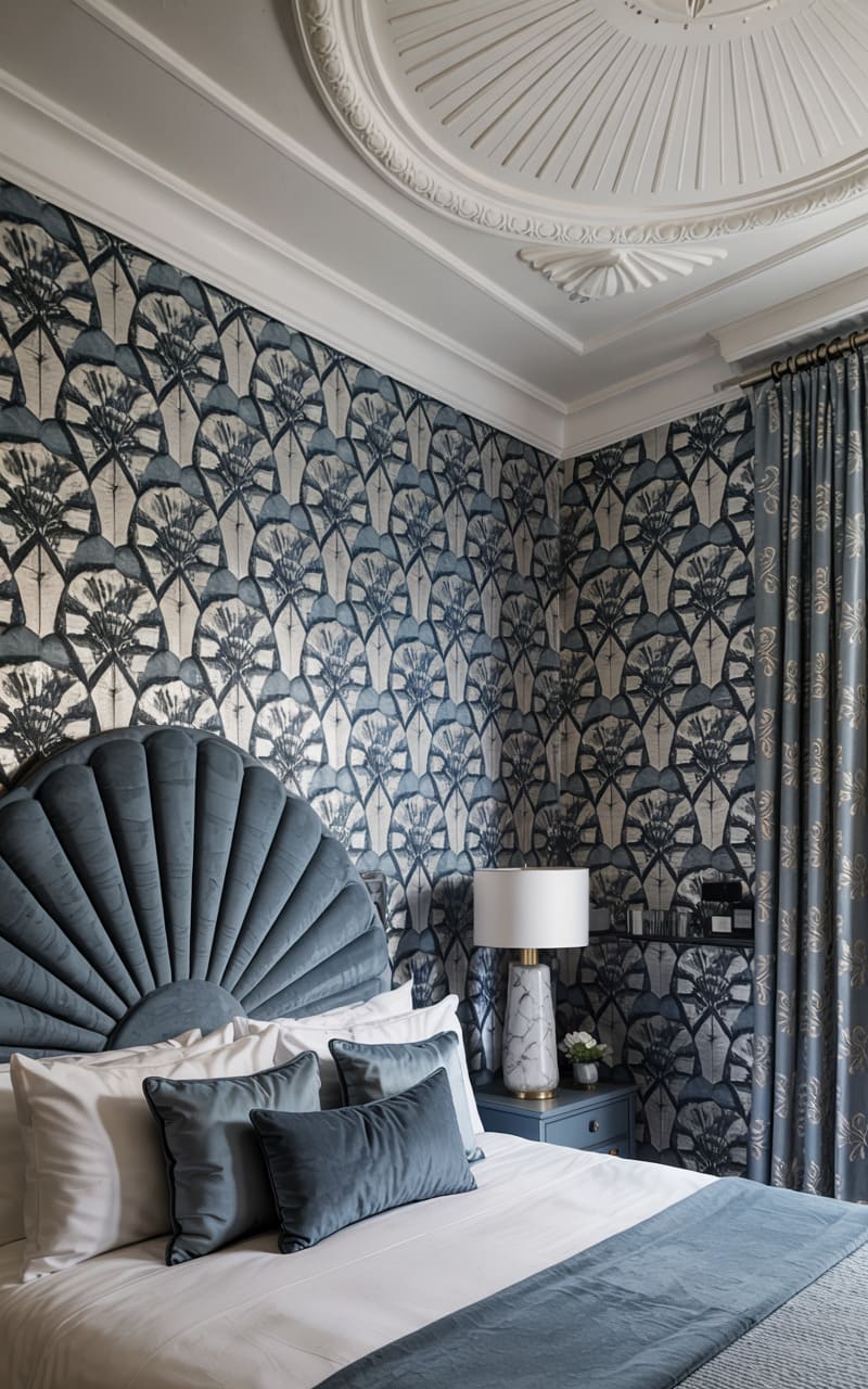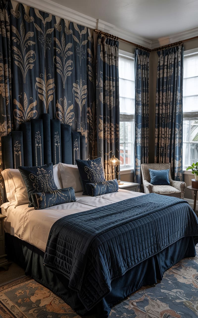 A dramatic, patterned curtain in deep blue and beige, featuring a large-scale stylized botanical motif, serves as a stunning backdrop for the bed in this Art Deco bedroom. The headboard, upholstered in deep blue velvet with a gently curved silhouette, complements the curtain’s richness. The bed is dressed in crisp white linens and a quilted blue bedspread, accented with patterned pillows. A traditional armchair offers a cozy reading spot. This room masterfully blends bold patterns and luxurious textures to create a sophisticated and inviting retreat.