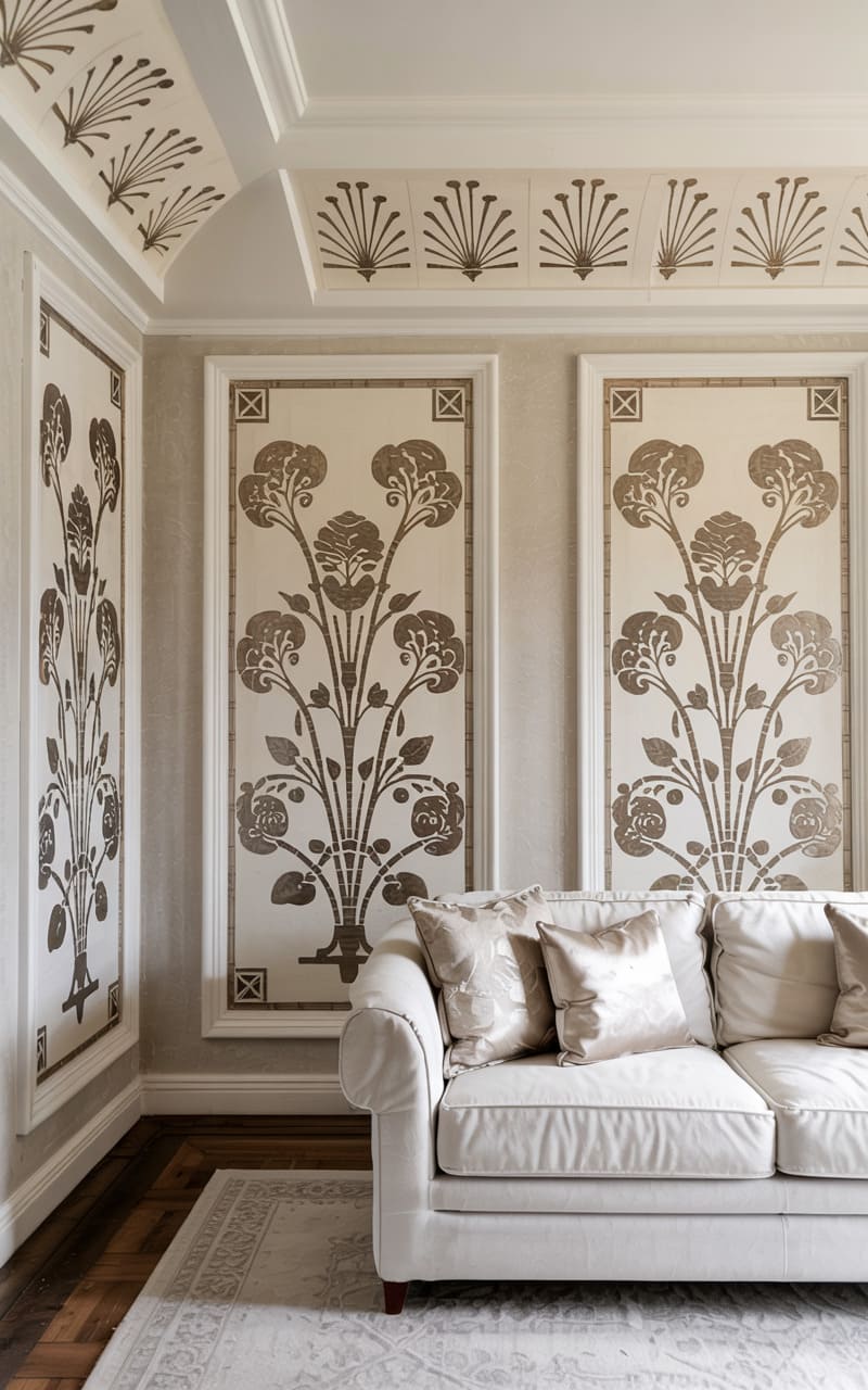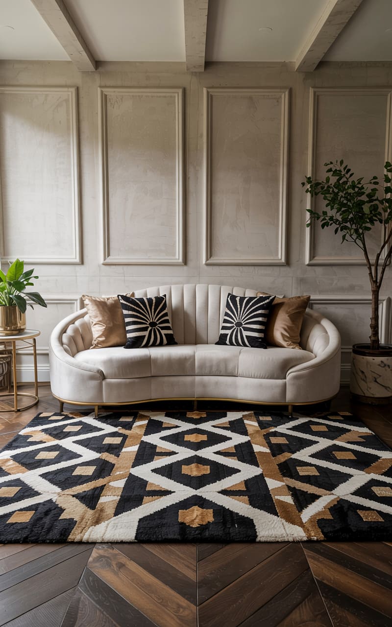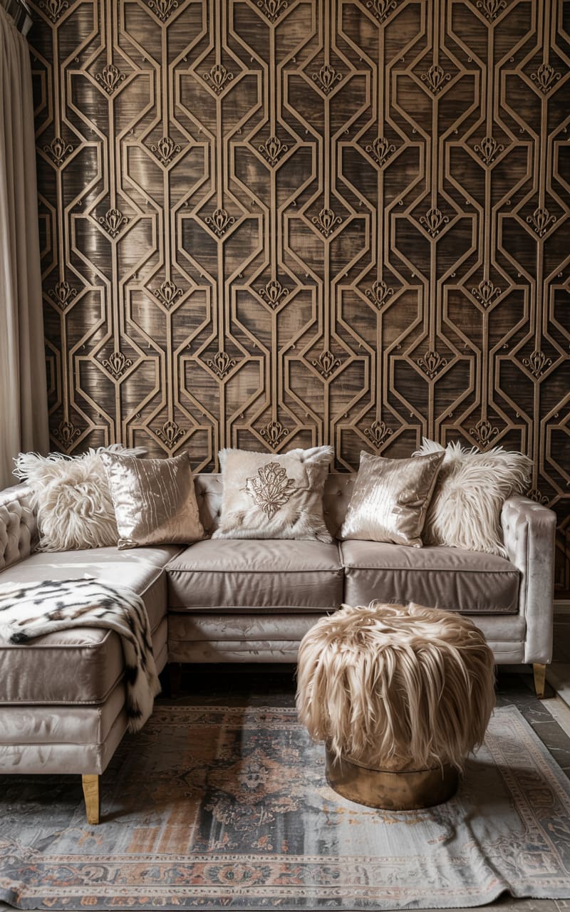 Opulent textures and a striking geometric backdrop define this Art Deco living space. A plush, light-toned velvet sectional sofa offers luxurious comfort, adorned with faux fur pillows and a patterned throw. A furry ottoman adds another layer of tactile richness. The wall behind the sofa is a masterpiece of carved wood, featuring an intricate, repeating geometric Art Deco pattern that commands attention. A vintage-style patterned rug grounds the seating area, creating a glamorous and inviting atmosphere with a strong focus on texture and bold design.
