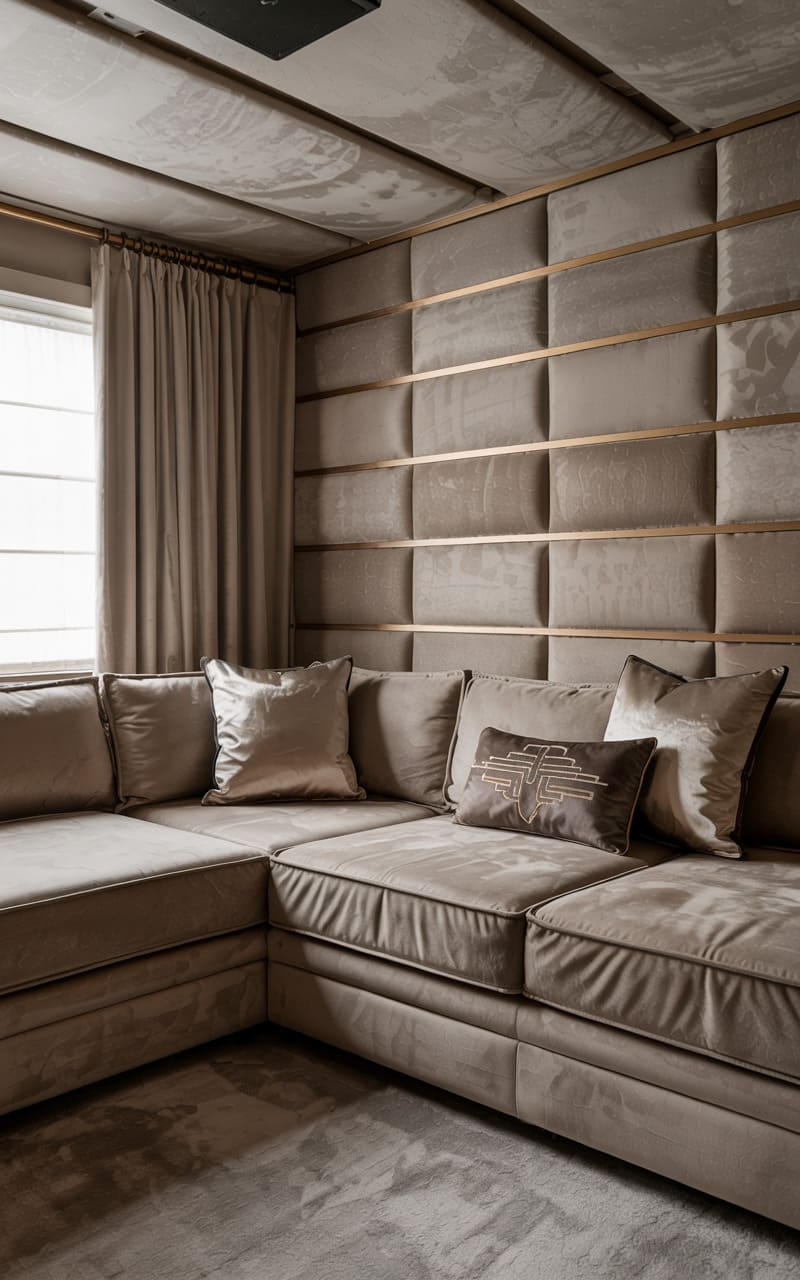 38. Contemporary Deco Media Room with Upholstered Walls