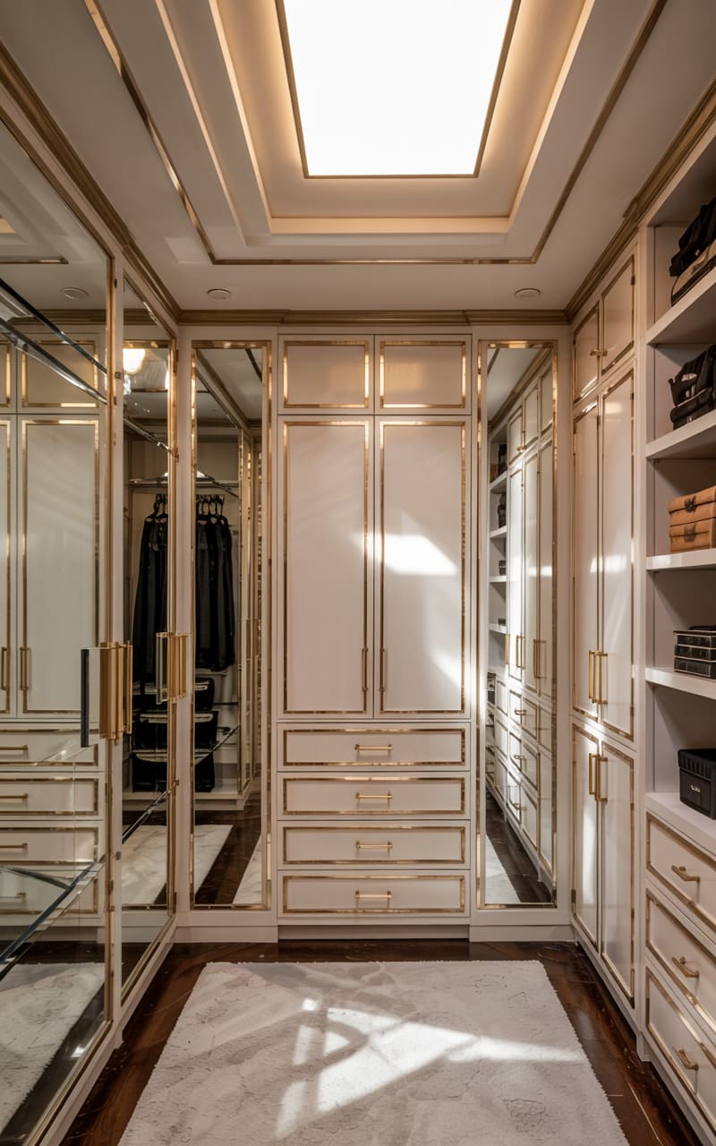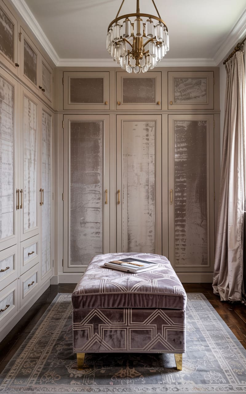 A sophisticated walk-in closet combines classic Art Deco elements with practical elegance. Tall, cream-colored wardrobe doors with antiqued mirror panels and simple brass handles line the walls, reflecting light and creating a sense of spaciousness. A plush, mauve velvet ottoman with a geometric pattern and gold feet sits at the center, offering a convenient place to rest. A classic crystal chandelier casts a sparkling glow, enhancing the room’s luxurious feel. The dark wood floor provides a warm contrast to the light cabinetry and soft textiles.