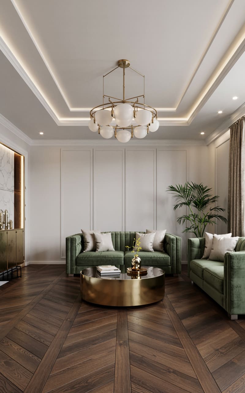 Clean lines and a harmonious color palette define this contemporary Art Deco living room. Two sofas upholstered in olive green velvet, accented with cream pillows, provide stylish and comfortable seating. A round, brass coffee table with a polished surface sits at the center, reflecting the light from the elegant, multi-globe chandelier above. The dark herringbone-patterned wood floor adds a classic touch. White walls with simple paneling and a brass-accented console cabinet complete this sophisticated and inviting space, blending modern comfort with timeless Deco elegance.