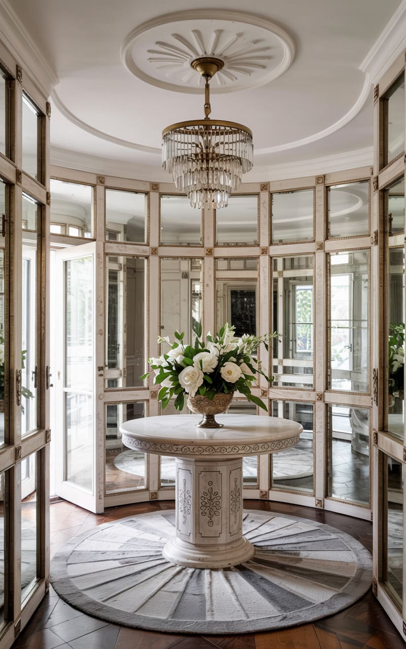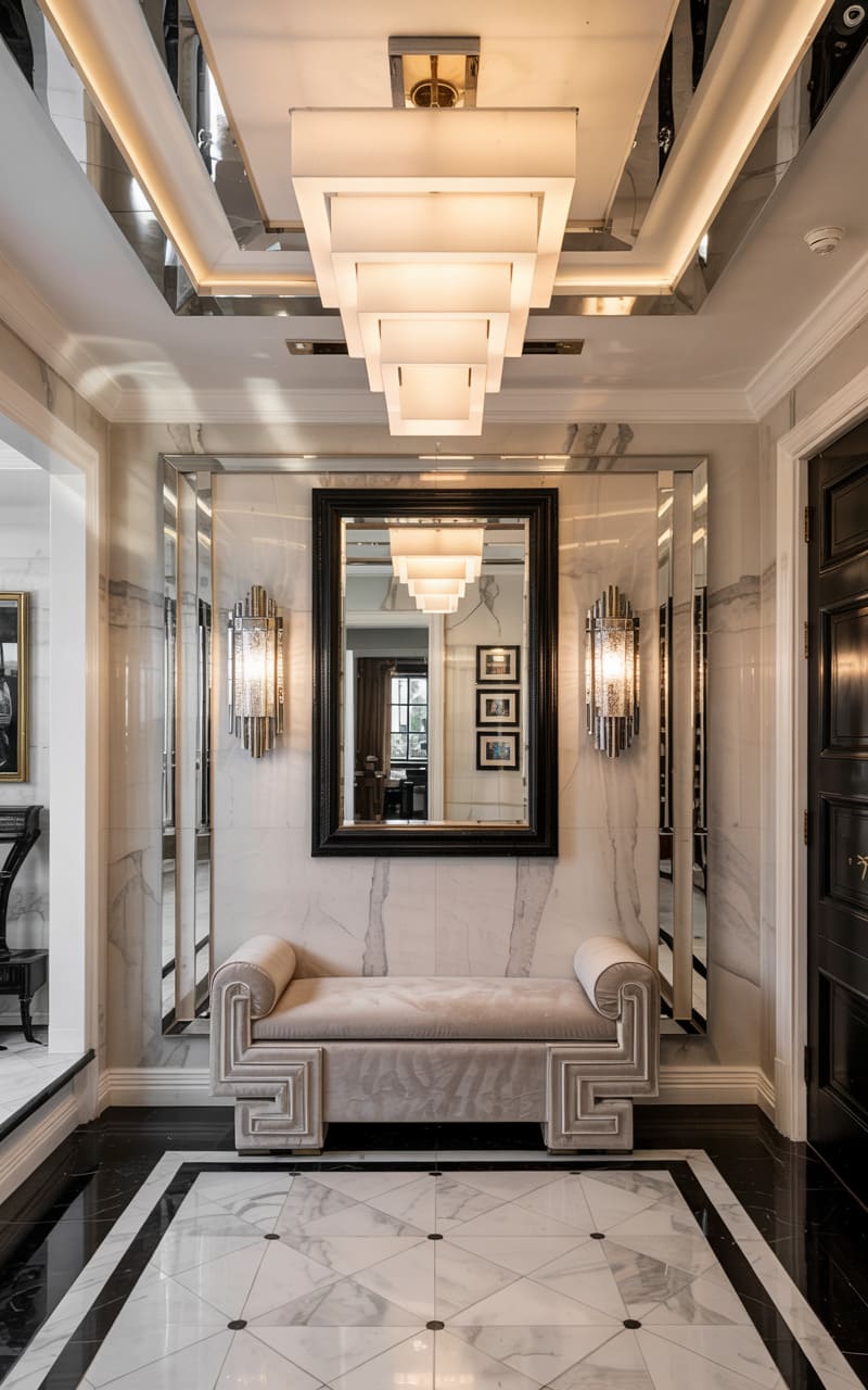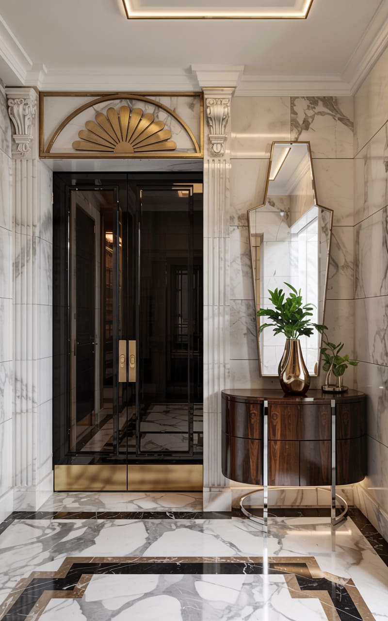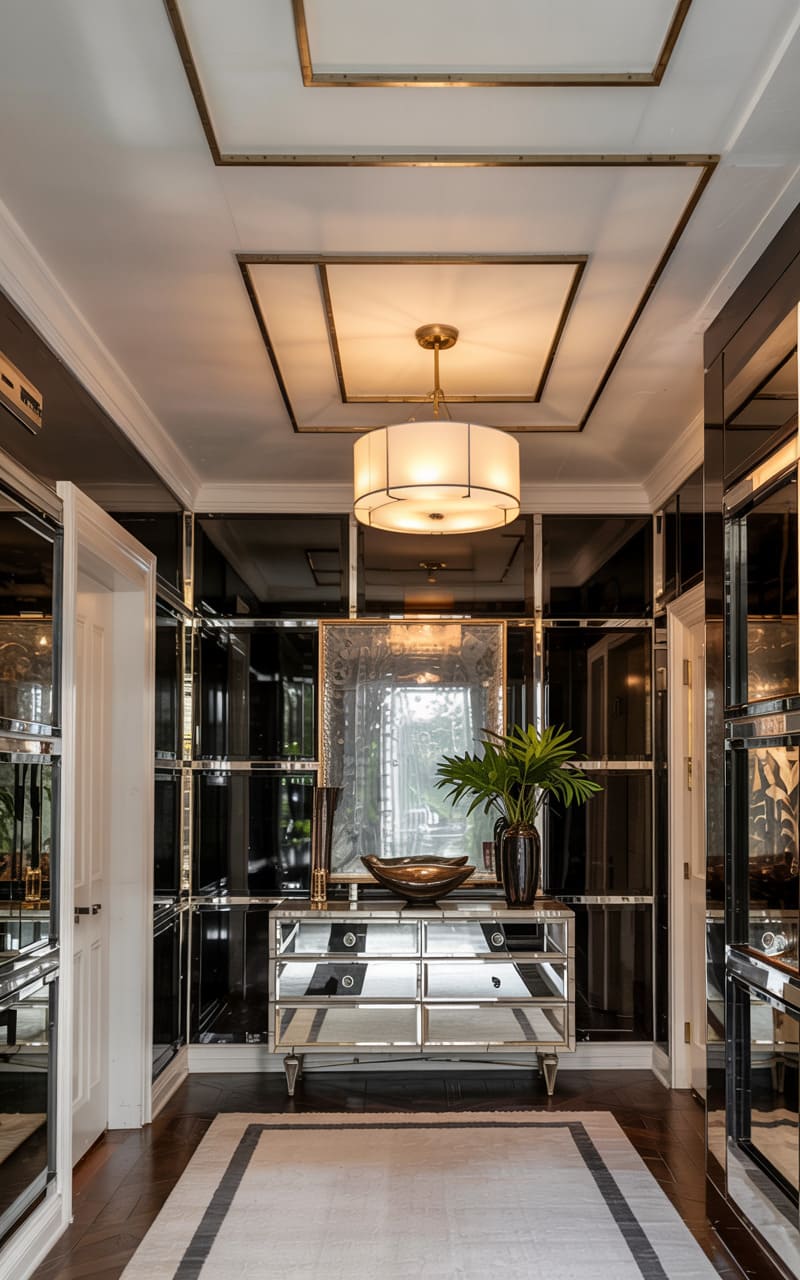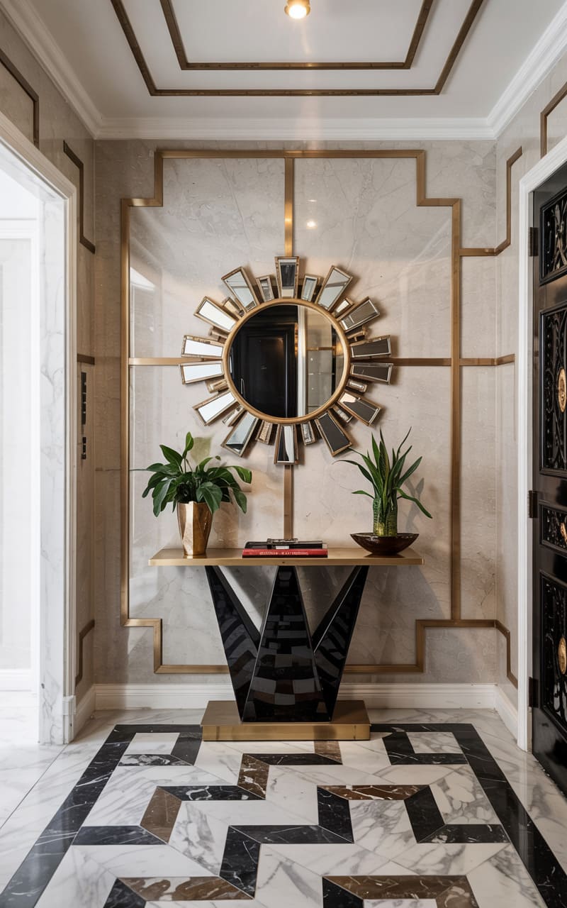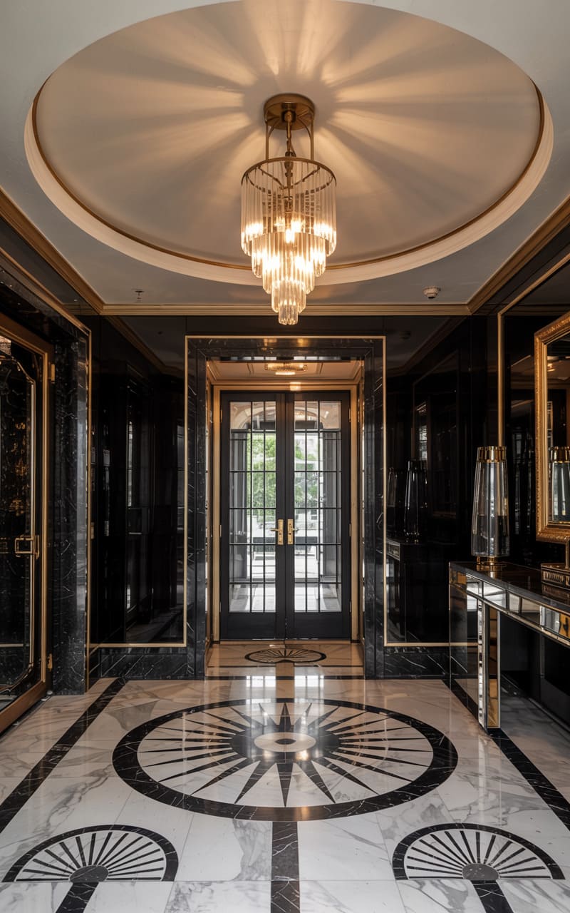Grandeur and dramatic contrasts define this Art Deco entryway. High-gloss black walls with gold trim and polished white marble flooring, inlaid with a bold black sunburst pattern, create a striking visual impact. A magnificent, multi-tiered crystal chandelier hangs from a recessed circular ceiling, casting a brilliant glow that reflects off the numerous surfaces. A console table with a mirrored top and gold frame stands against one wall, adding to the room’s opulent, reflective quality. This foyer is designed to impress, a dazzling introduction to a luxurious interior.