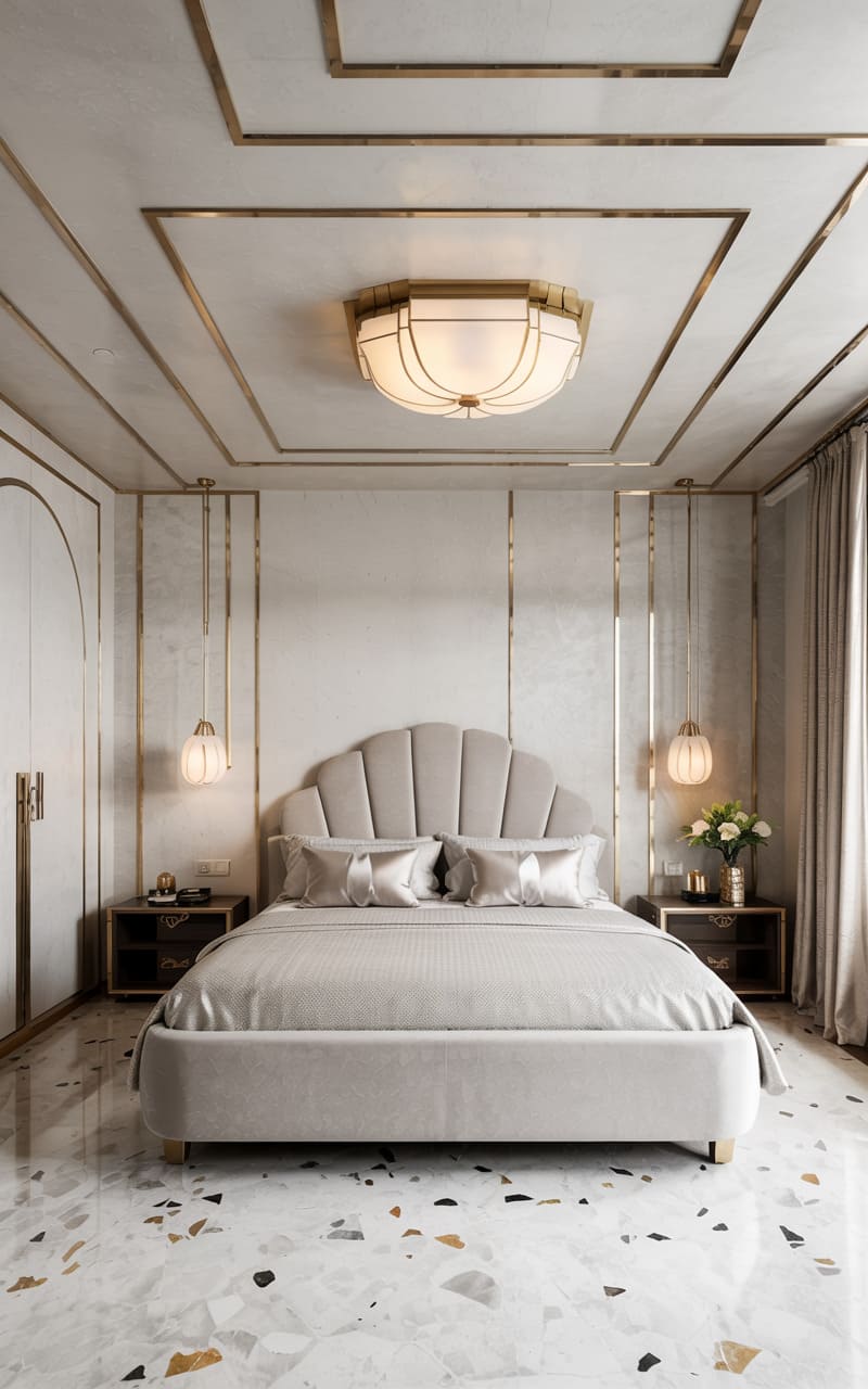 Serene elegance and soft, warm tones characterize this Art Deco bedroom. A scalloped, cream-upholstered headboard creates a gentle focal point, complemented by dark wood nightstands. Delicate pendant lights with globe shades hang on either side of the bed, casting a soft, ambient glow. The walls are a light, textured stone, accented with vertical gold trim that extends onto the ceiling, creating a sense of height and subtle glamour. Terrazzo flooring with warm-toned chips adds a touch of classic Deco patterning to this tranquil and sophisticated retreat.