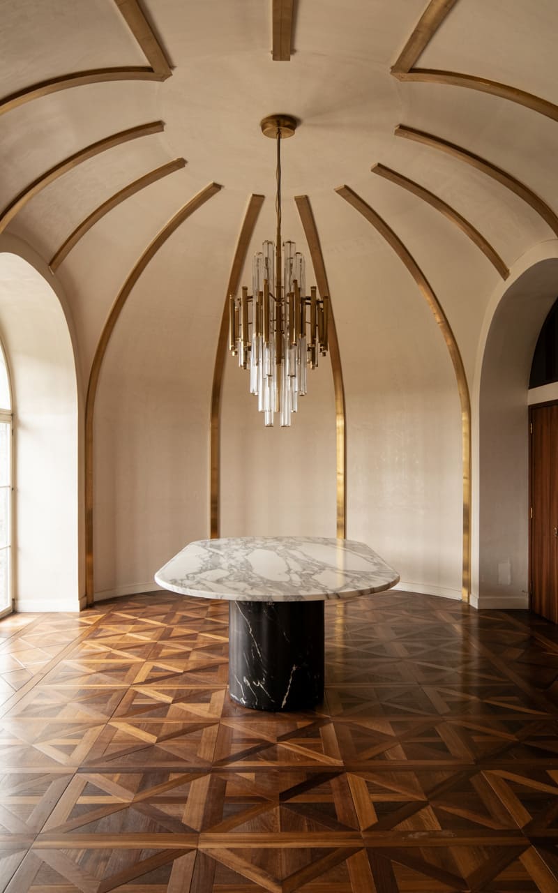 A voluminous, light-filled space is transformed into a minimalist Art Deco dining area. A massive, veined marble tabletop with a softly squared oval shape rests upon a substantial black cylindrical base, creating a sculptural centerpiece. A cascading crystal and brass chandelier hangs from the dramatically high, arched ceiling, its form echoing the room’s grand curves. Arched niches, accented with gold trim, line the walls. The polished parquet wood floor, laid in a geometric pattern, adds warmth and texture to this strikingly elegant and airy room.