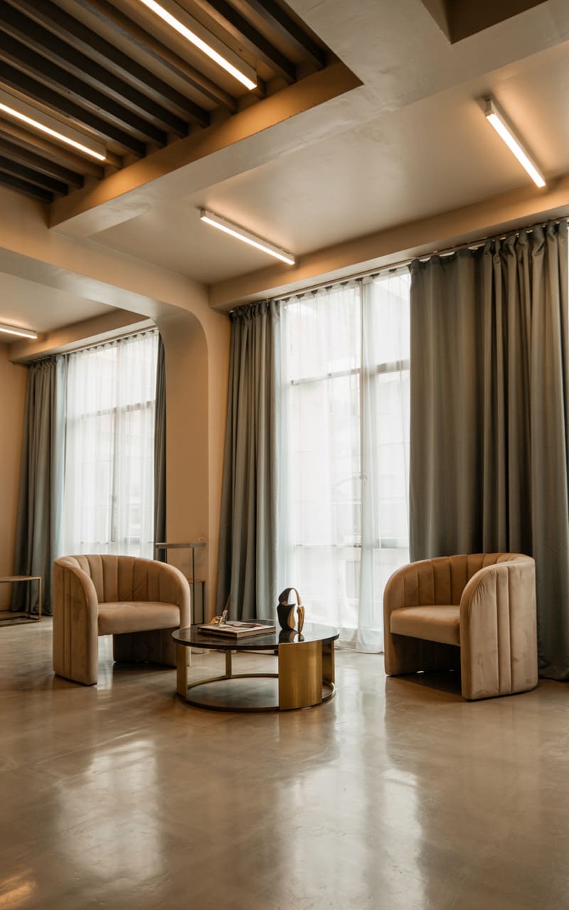 An industrial loft space is softened with Art Deco touches, creating a chic, minimalist seating area. Two barrel-backed armchairs in a plush beige velvet offer comfortable seating around a round coffee table with a dark top and a ribbed brass base. Tall windows, dressed with sheer and heavy grey curtains, allow ample natural light to fill the space, reflecting off the polished concrete floor. Simple, linear fluorescent-style lights on the ceiling provide contemporary illumination, highlighting the blend of raw industrial elements and refined Deco details.