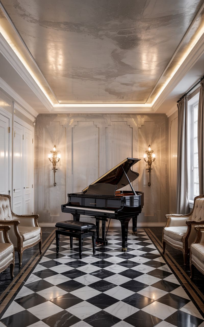 A dramatic, black and white checkerboard marble floor sets a grand stage in this Art Deco music room. A gleaming black grand piano and matching stool command the center, ready for a virtuoso performance. Elegant, cream-upholstered armchairs with gilded wood frames offer sophisticated seating for an audience. Ornate, candelabra-style wall sconces cast a warm, inviting glow, reflected in the shimmering, textured silver-leafed ceiling. This room is a masterpiece of classic Deco glamour, designed for both musical artistry and appreciative listening in a luxurious setting.