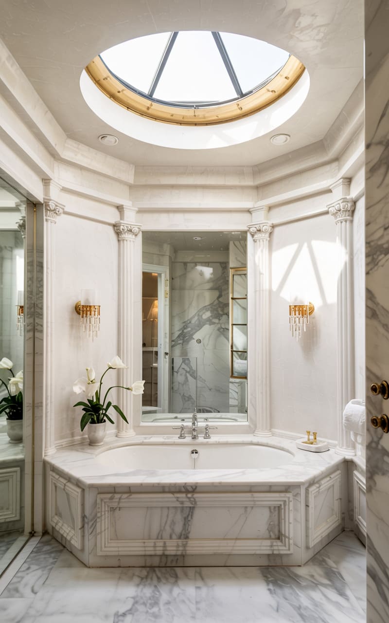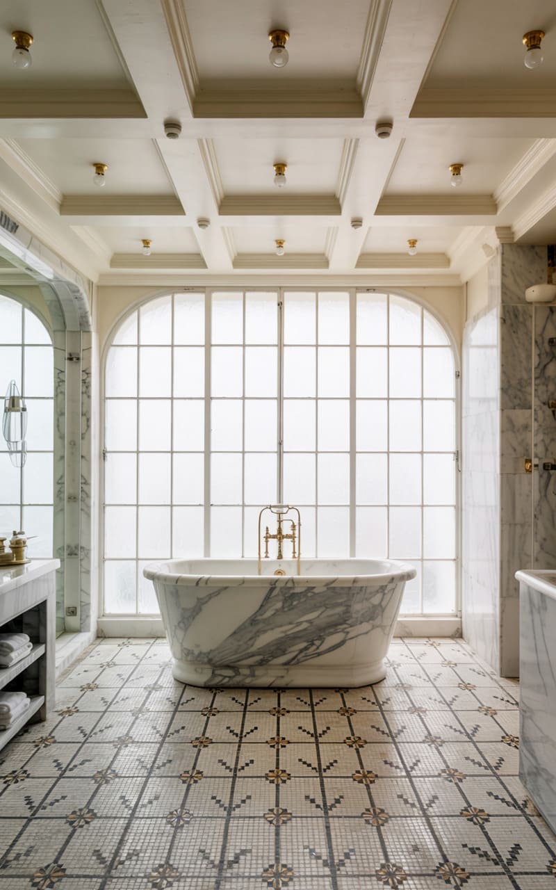 A sense of serene opulence pervades this spacious Art Deco bathroom. A large, freestanding marble bathtub, its surface beautifully veined, sits before a massive, frosted glass window divided into numerous panes, allowing a soft, diffused light to fill the room. The floor is a mosaic of small, patterned tiles, adding intricate detail. A marble vanity with open shelving provides storage. The coffered ceiling with small, inset lights enhances the room’s classic, luxurious ambiance, creating a spa-like retreat for indulgent relaxation.