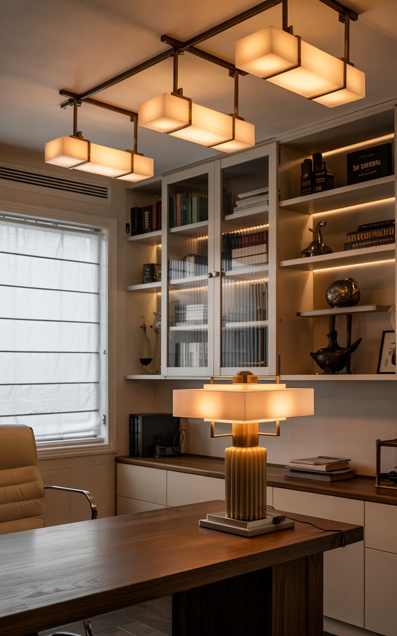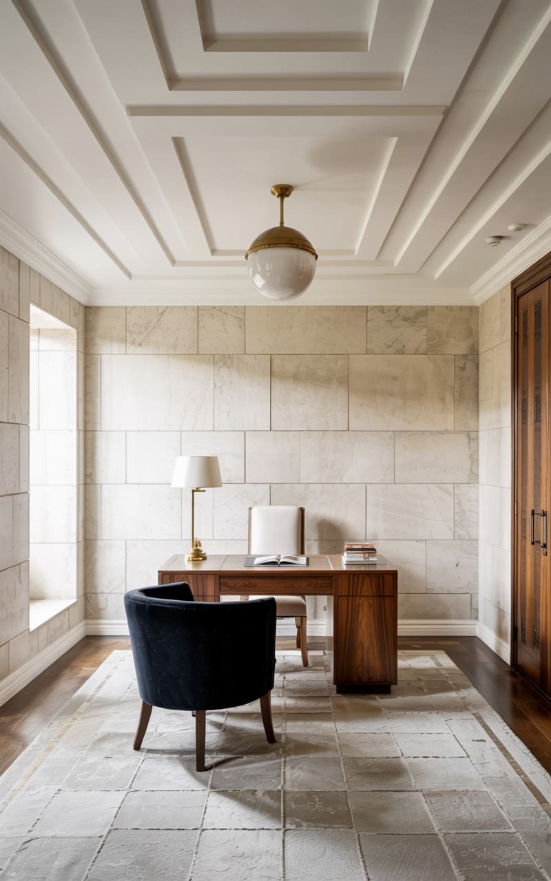 Understated elegance and a focus on natural light define this Art Deco home office. A simple wooden desk with clean lines is paired with a dark velvet chair, offering a comfortable and stylish workspace. A tall, slender window allows natural illumination to grace the room, reflecting off the light-toned, stone-paneled walls. A classic globe pendant light hangs from the coffered ceiling. A subtly patterned, light-colored rug adds a touch of warmth and texture, completing this serene and productive environment, perfect for focused work.