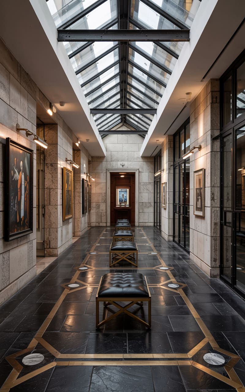 A long, gallery-like hallway exudes Art Deco grandeur with its stone-clad walls and dark, polished stone floor, inlaid with a geometric pattern in gold and white marble. A pitched glass skylight runs the length of the ceiling, allowing natural illumination to cascade into the space. Small, black leather-upholstered benches with brass X-frames are arranged along one wall, offering brief moments of repose. Framed artwork hangs on the walls, enhancing the hall’s sophisticated, museum-like quality and creating an impressive transitional space.