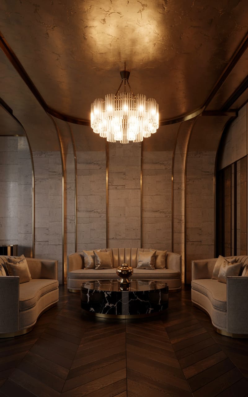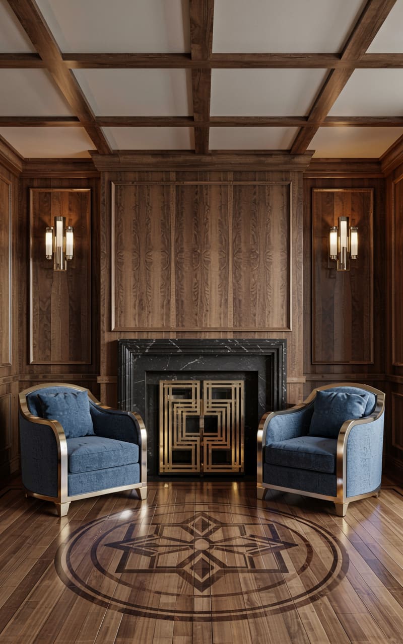 50. Art Deco Lounge with Dark Oak Chevron Flooring and Gold-Leafed Ceiling