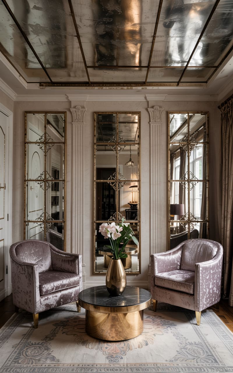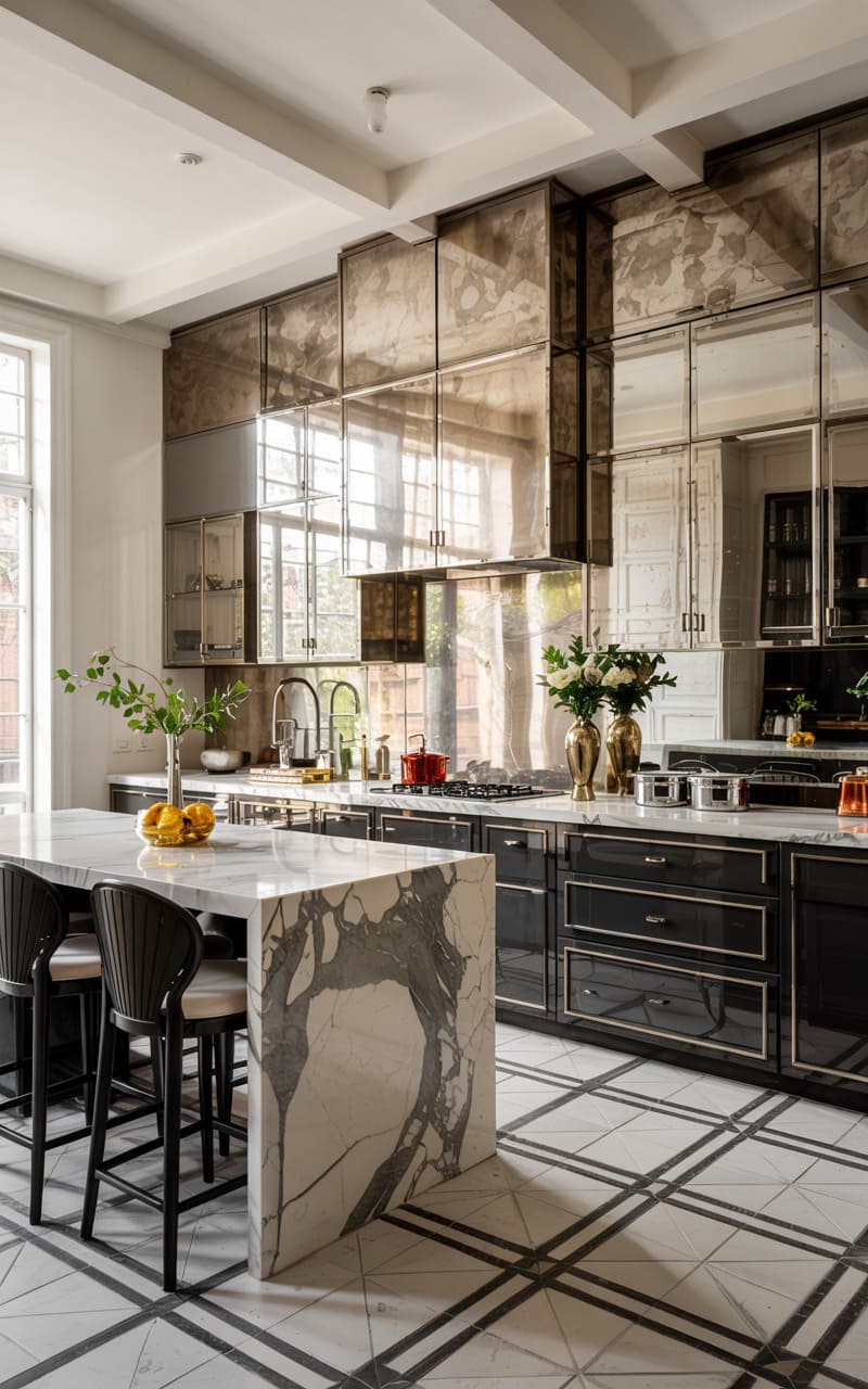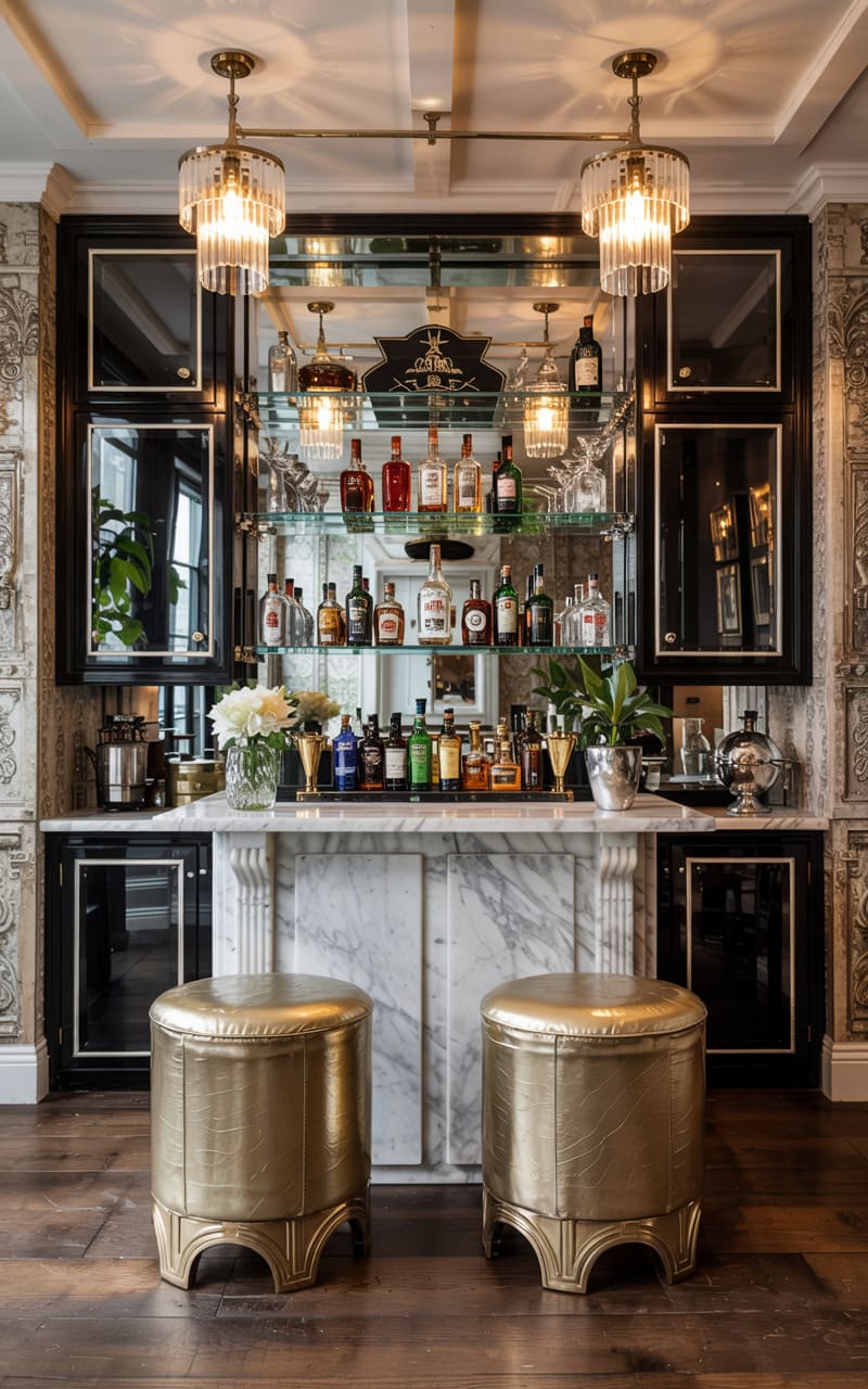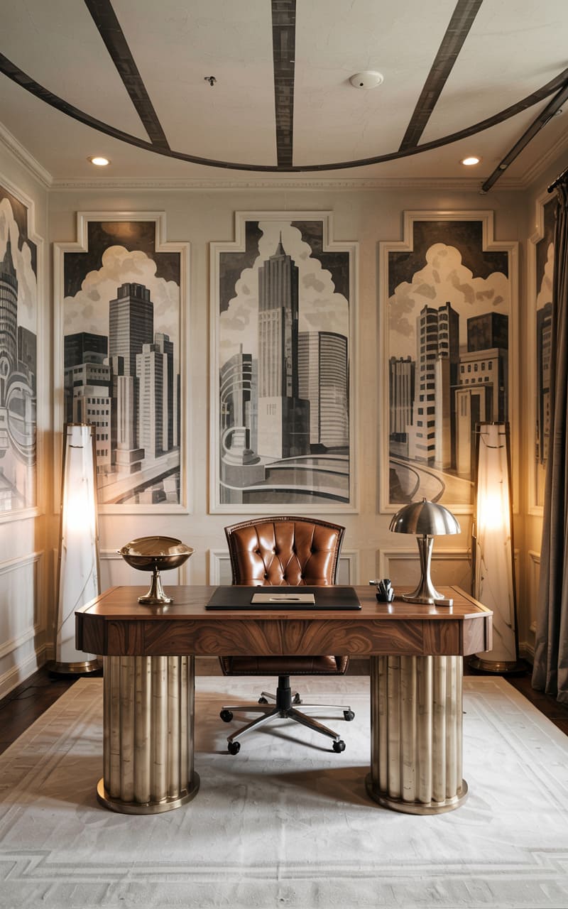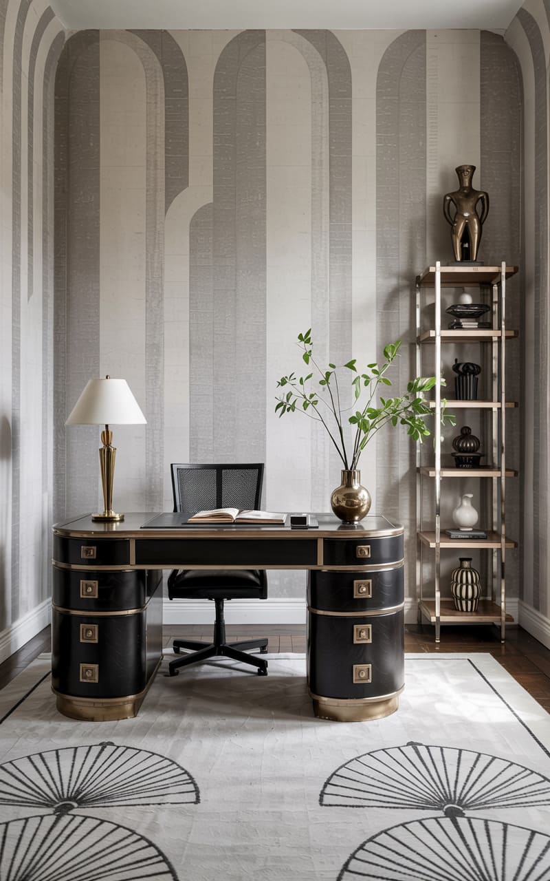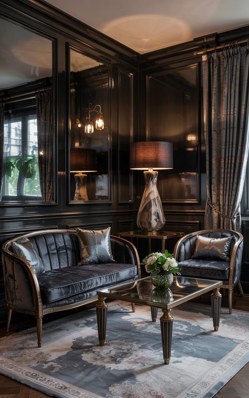 20. High-Contrast Art Deco Studio with Steel and Mirror Finishes