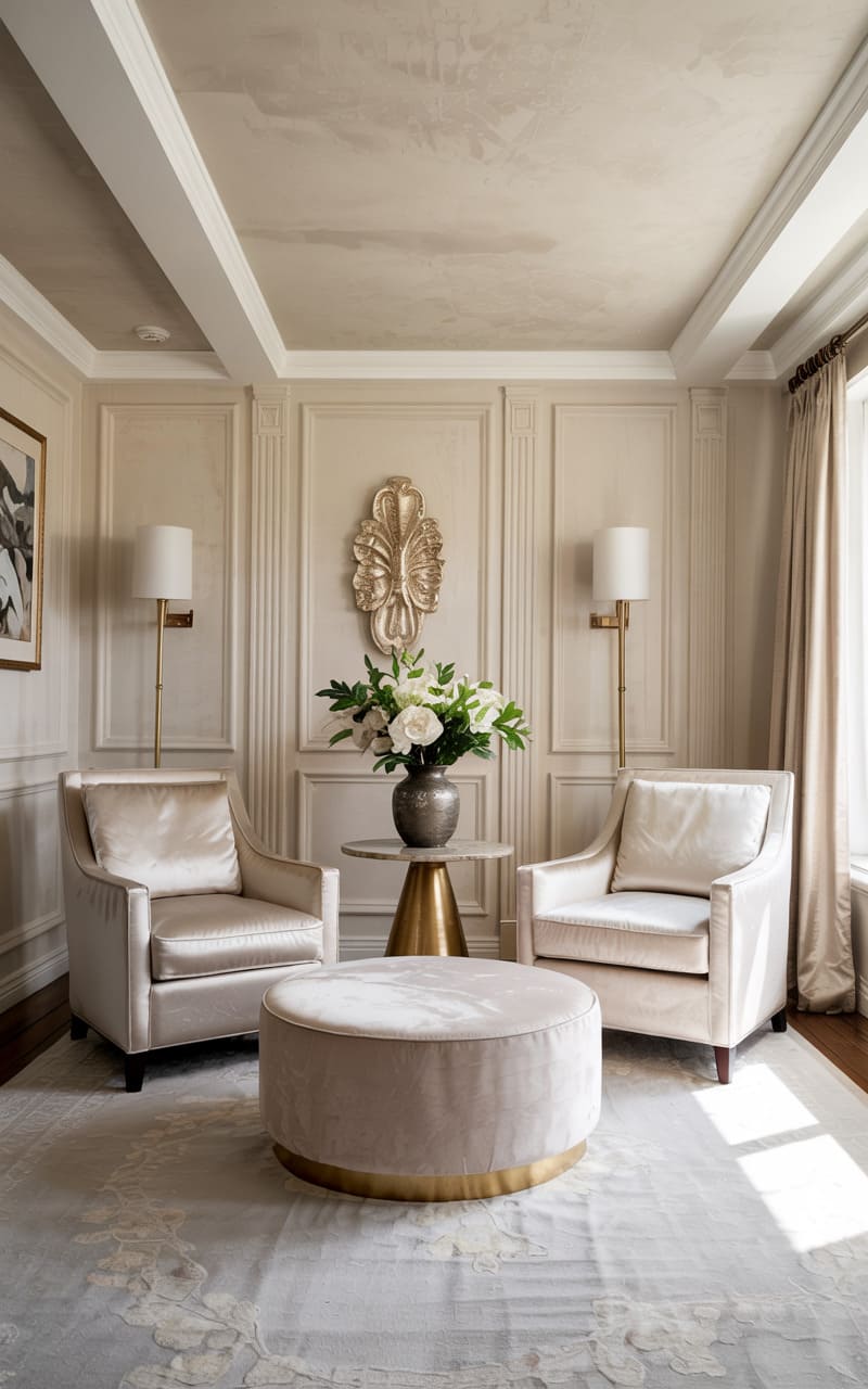 Understated elegance and soft, neutral tones characterize this Art Deco seating area. A large, light beige velvet sectional sofa nestles into a corner, offering ample, comfortable seating. The wall behind is upholstered in quilted square panels, separated by thin gold metallic strips, adding a touch of subtle glamour and texture. Shimmering satin pillows in coordinating hues enhance the luxurious feel. The overall ambiance is one of serene sophistication and refined comfort, a perfect space for relaxation.