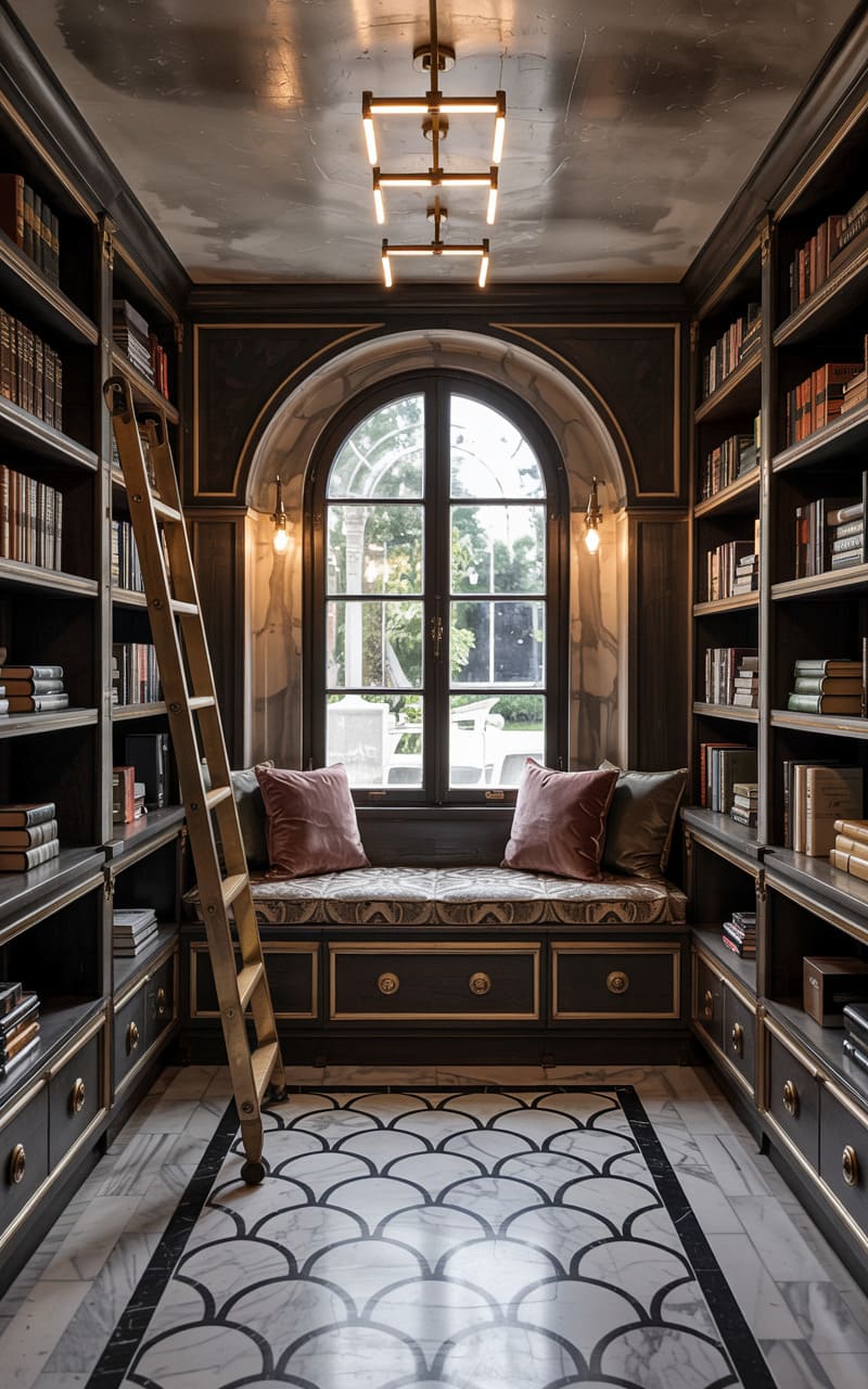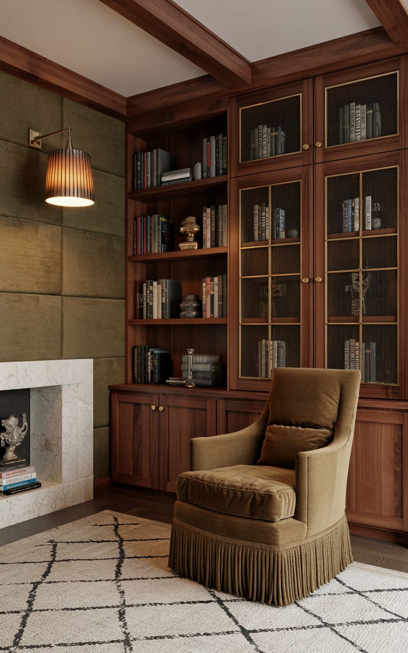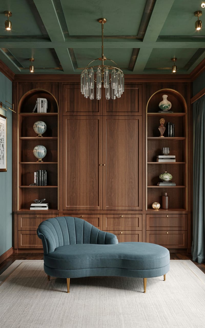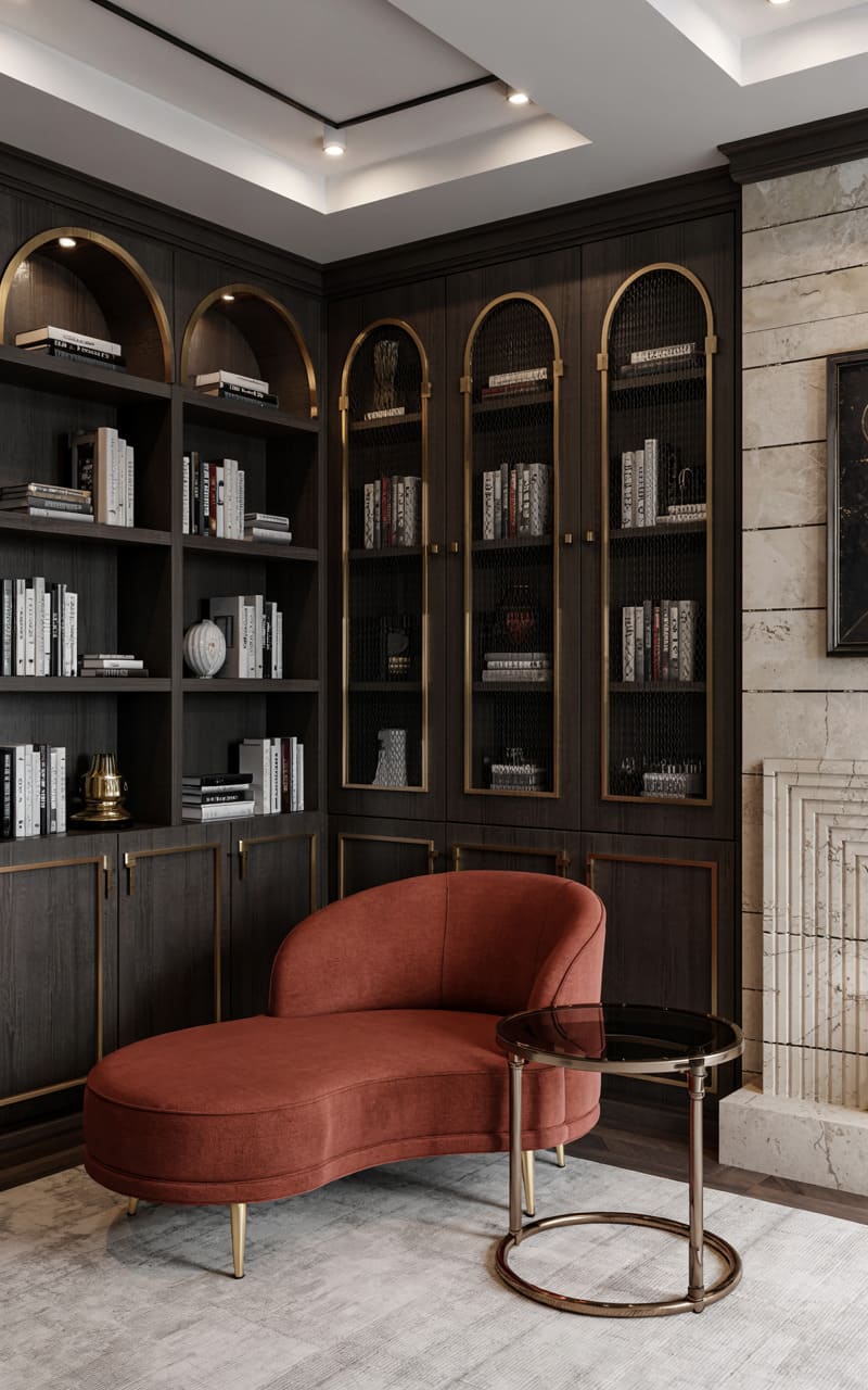 Rich, dark wood and classic architectural details create a sophisticated and scholarly atmosphere in this Art Deco library or reading nook. Built-in bookshelves, some with arched tops and delicate gold mesh-fronted doors, line the walls, filled with books and decorative objects. A comfortable chaise lounge, upholstered in a deep terracotta velvet with elegant gold legs, invites relaxation. A small, circular side table with a dark top and a brass base provides a convenient surface. A light-colored, subtly patterned rug grounds the space.