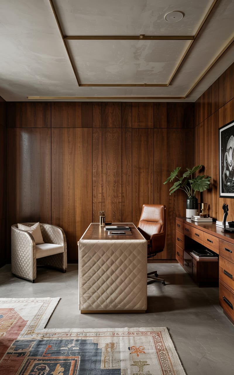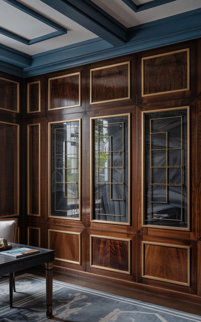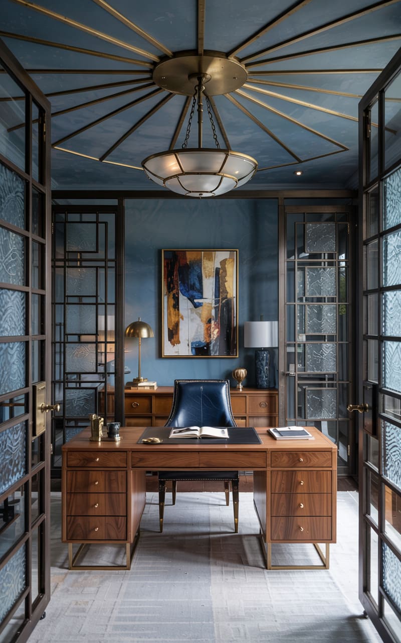 A sophisticated and masculine ambiance pervades this Art Deco home office, accessed through elegant, dark-framed glass doors with a geometric, reeded pattern. A substantial, dark walnut desk with multiple drawers and brass hardware offers an impressive workspace, complemented by a black leather chair. A dark wood credenza displays a large, abstract painting. The walls are a textured, muted blue-grey, and the ceiling features a striking, geometric brass inlay reminiscent of a sunburst. A classic brass desk lamp provides focused illumination.