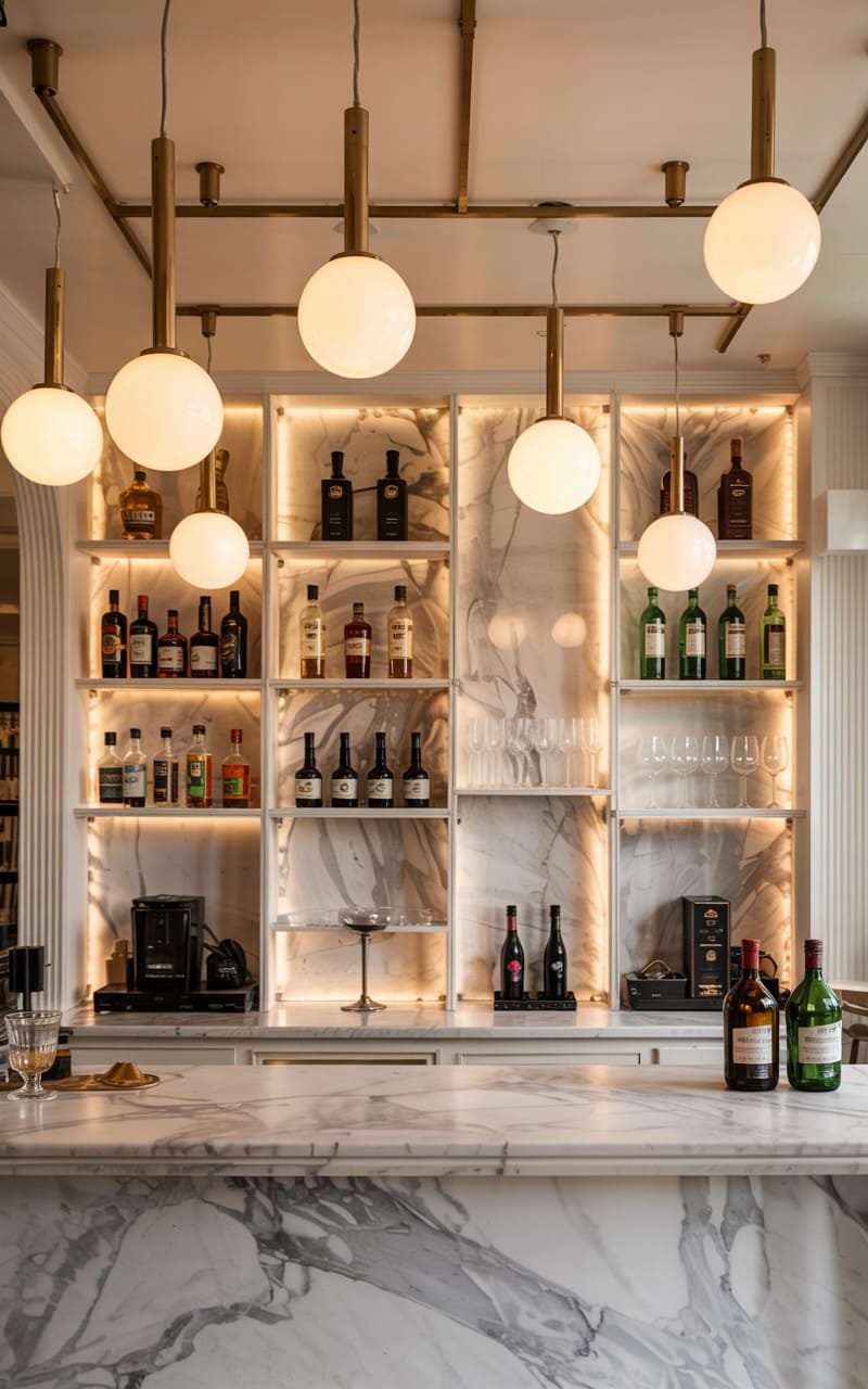 195. Home Bar with Sapphire Blue Tiles and Geometric Mirror Shelves