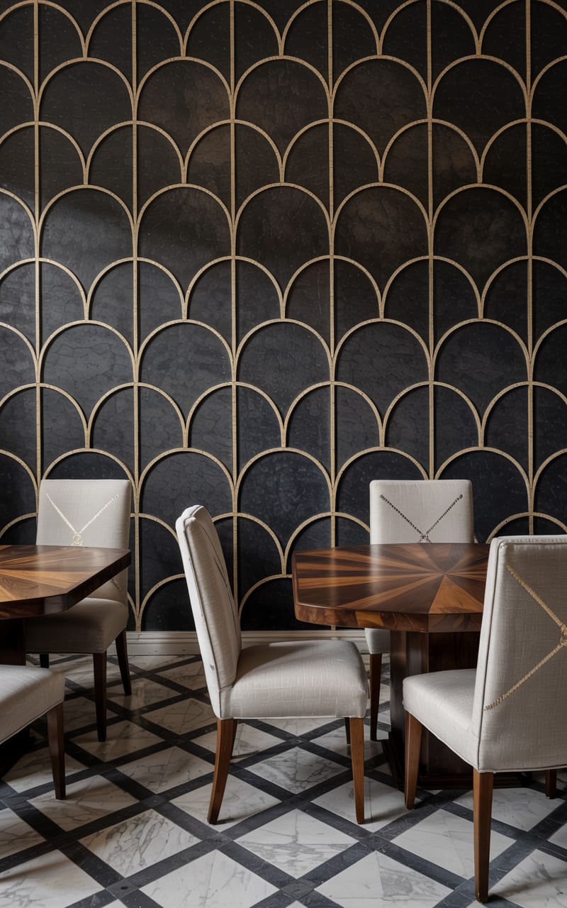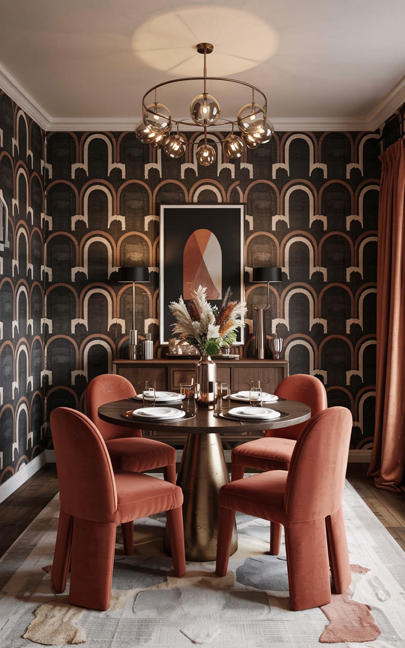 Warm, earthy tones and bold, geometric patterns create an inviting and stylish Art Deco dining space. Chairs upholstered in a rich terracotta velvet surround a circular, dark wood table with a sculptural brass base. The walls are adorned with a striking wallpaper featuring a repeating, oversized arch motif in shades of brown, black, and terracotta. A dark wood credenza displays decorative objects and a large, abstract artwork. A light-colored rug with subtle, abstract patterning grounds the space.