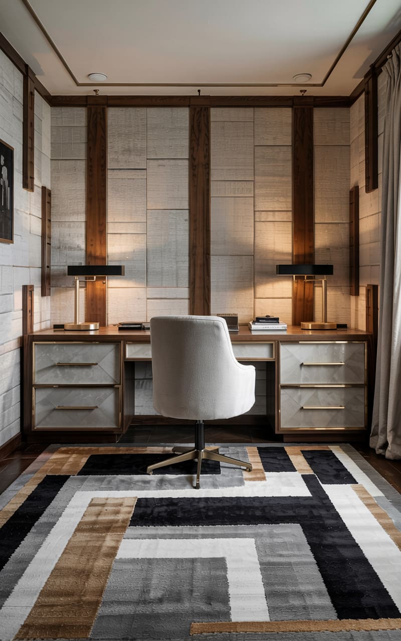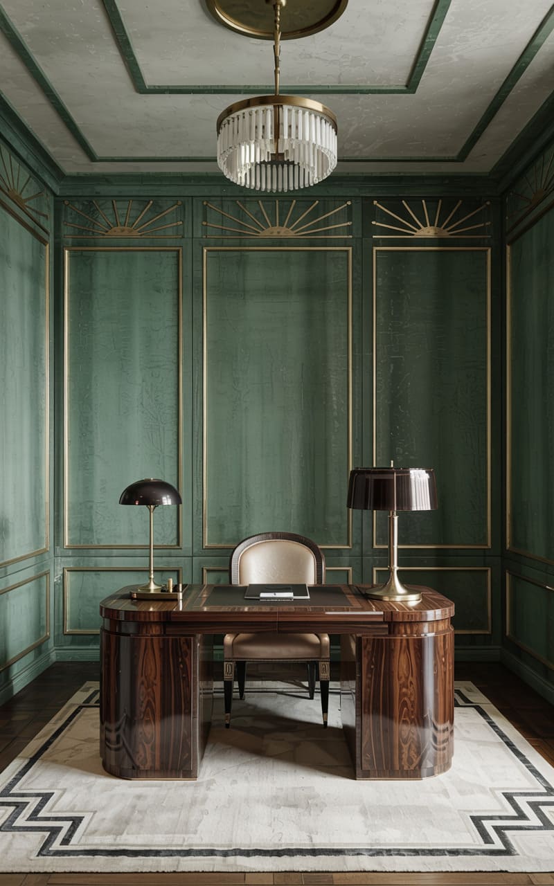 A distinguished and refined atmosphere defines this classic Art Deco home office. Walls are clad in a textured, deep green material, featuring elegant paneling outlined in delicate gold trim, with stylized sunburst motifs in the upper corners. A substantial, dark wood desk with curved ends and a leather inset top offers an elegant workspace, complemented by a chair upholstered in cream leather. Two matching, classic desk lamps provide focused illumination. A light-colored rug with a bold, black geometric border grounds the space.