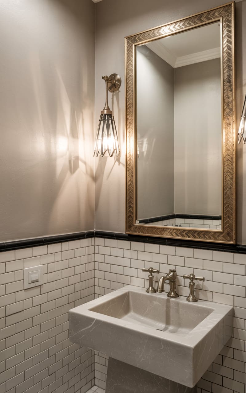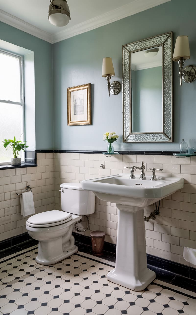 Understated elegance and classic simplicity define this Art Deco bathroom. White subway tiles form a wainscoting, topped with a simple black border, contrasting with the pale blue upper walls. A traditional white pedestal sink and toilet provide clean, timeless forms. A rectangular mirror with an ornate, silver-leafed frame hangs above the sink, flanked by simple, shaded wall sconces. A framed artwork adds a touch of personality. The black and white octagonal tile floor with small black diamond inserts completes this charming and well-proportioned space.