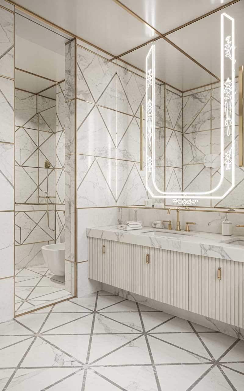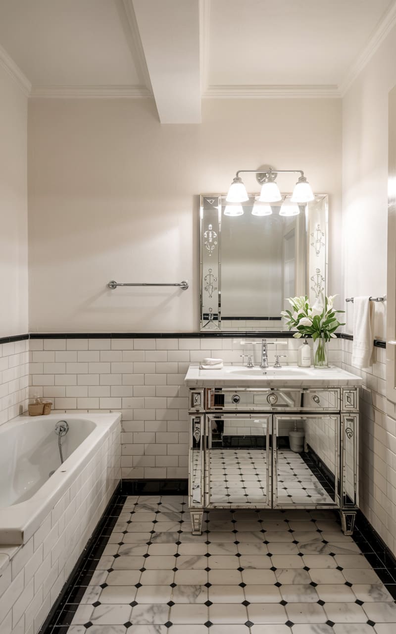 5. Monochrome Art Deco Bathroom with Chrome Fixtures