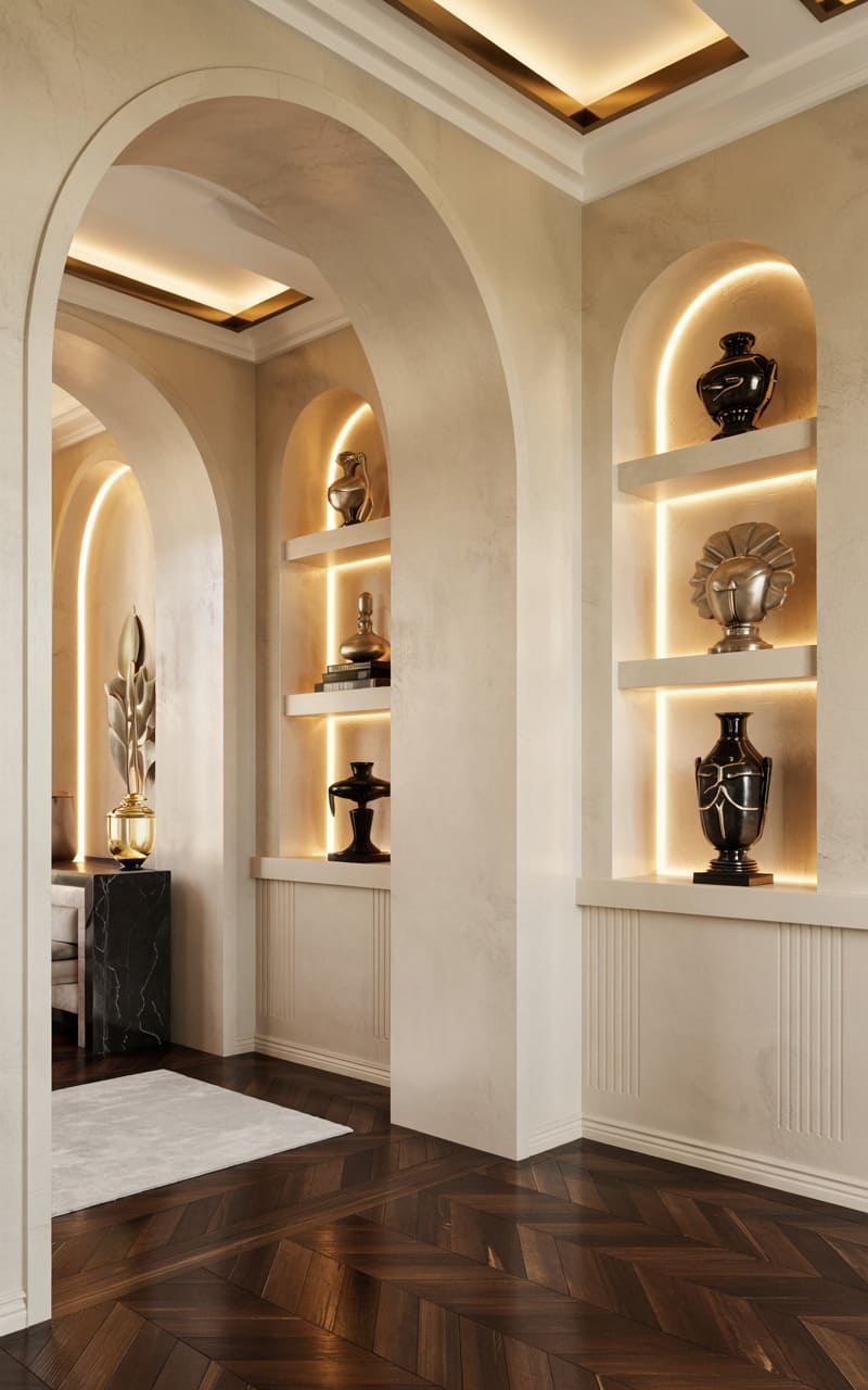 19. Deco-Inspired Gallery Hallway with Textured Plaster and Bronze