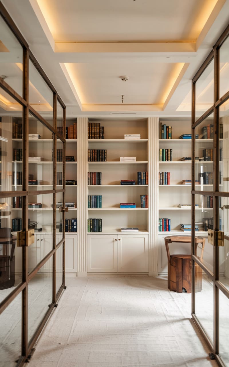 193. Home Library with Teal Bookcases and Stepped Ceiling Panels