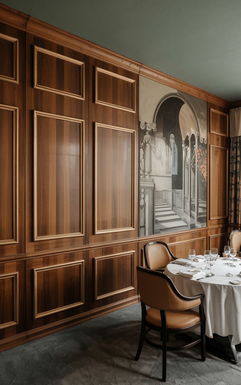 44. Deco Dining Room with Parquet Flooring and Barrel Vault Ceiling