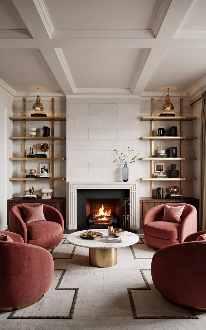 A playful, color-blocked design and graceful curves define this contemporary Art Deco living space. The wall is divided into two sections, one in a soft coral pink and the other in a creamy off-white, separated by a minimalist shelving unit. A curved, light-colored sofa is accented with pink satin pillows. Two barrel-backed armchairs in a rich coral velvet provide additional seating around a dark, drum-shaped coffee table with a ribbed brass base. Sculptural accessories and a simple wall sconce complete this chic and artistic room.