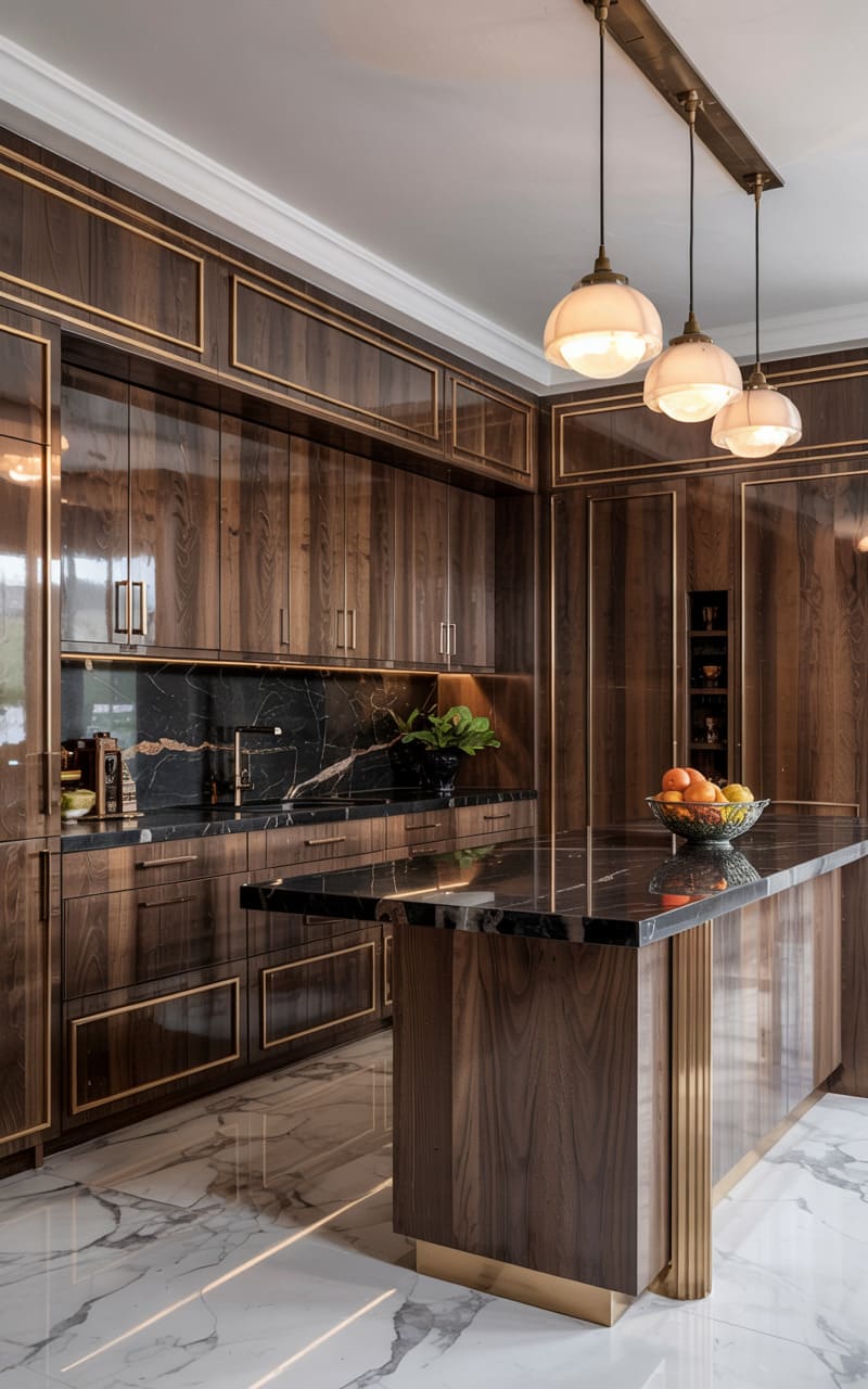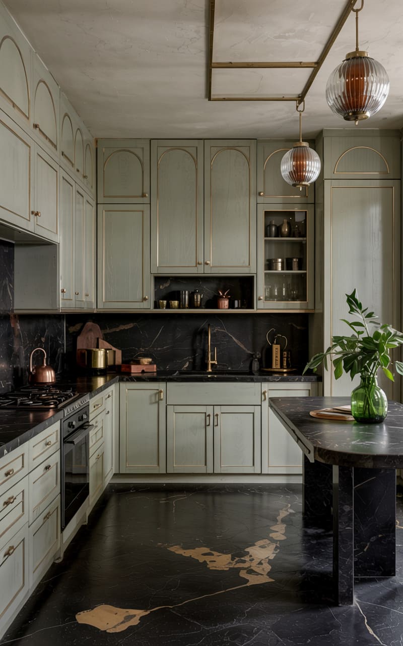 Understated sophistication and a harmonious blend of natural materials characterize this Art Deco kitchen. Sage green, flat-panel cabinetry with delicate gold trim provides a soft, muted color palette. Black marble countertops and a matching backsplash, dramatically veined with gold, create a striking contrast. The floor is a unique expanse of black marble with large, irregular gold veining, resembling a natural abstract painting. Two ribbed glass globe pendant lights, suspended from a brass rod, cast a warm glow.