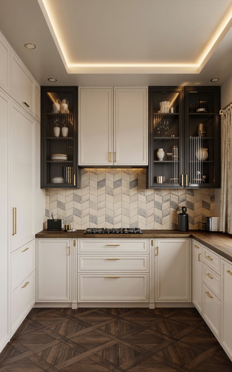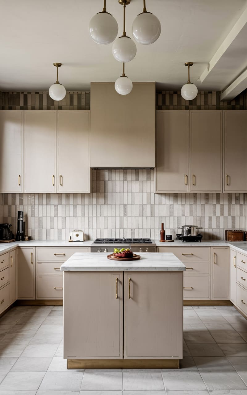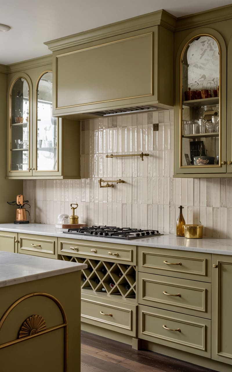Understated elegance and a focus on refined details characterize this Art Deco kitchen. Olive green, shaker-style cabinetry with delicate gold trim and hardware provides a soft, muted color palette. White marble countertops offer a luxurious work surface. The backsplash features vertically stacked, rectangular tiles in a creamy off-white. An open wine rack is integrated into the lower cabinetry. Arched, glass-fronted upper cabinets display a collection of glassware. This kitchen exudes a timeless, sophisticated charm.