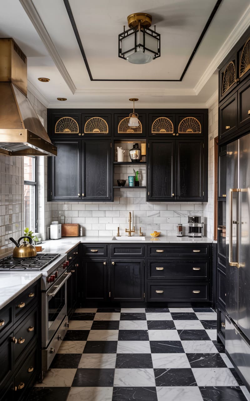 161. Art Deco Kitchen with Deep Teal Cabinetry and Brass Detailing
