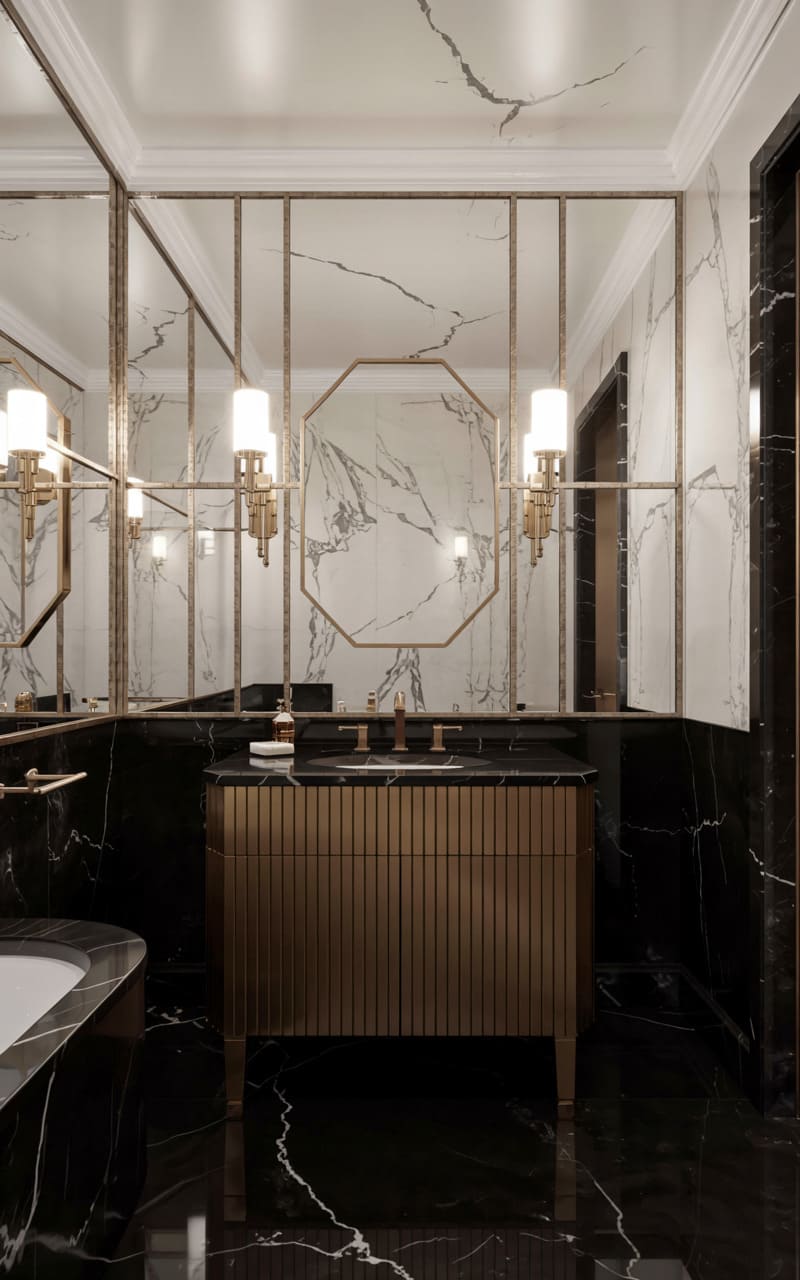 Deep, moody sophistication pervades this luxurious Art Deco bathroom. Walls are clad in striking black marble with dramatic gold veining. Two tall, arched mirrors hang above a long, dark, ribbed vanity with elegant gold hardware and legs. Slender, tiered light fixtures, reminiscent of classic Deco skyscraper motifs, flank the mirrors, casting a warm, ambient glow. Dried pampas grass in a white vase adds a touch of organic softness. The dark, patterned tile floor completes this opulent and refined sanctuary.