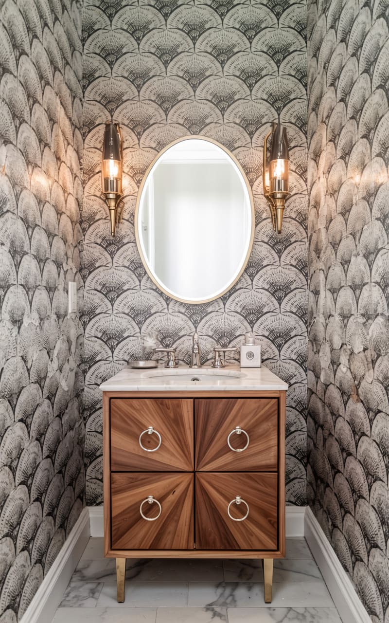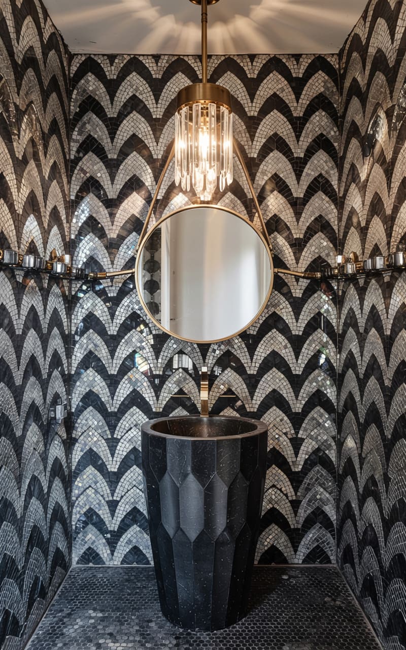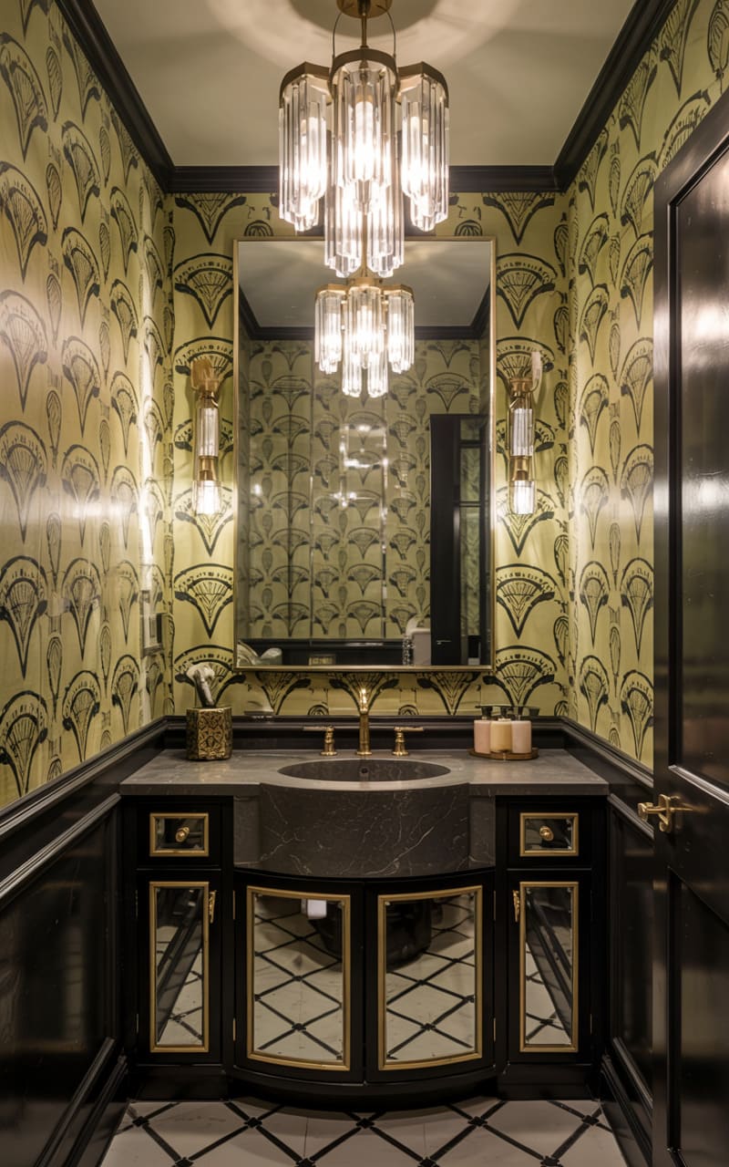 A dramatic interplay of pattern and dark, glossy surfaces characterizes this sophisticated Art Deco powder room. Wallpaper featuring a repeating fan or shell motif in black and gold adorns the walls. A black, lacquered vanity cabinet with gold trim and mirrored door panels provides stylish storage. A black stone countertop and sink add to the moody elegance. A magnificent, multi-tiered crystal chandelier hangs from the ceiling, its light reflected in the large, framed mirror and the classic black and white patterned tile floor.